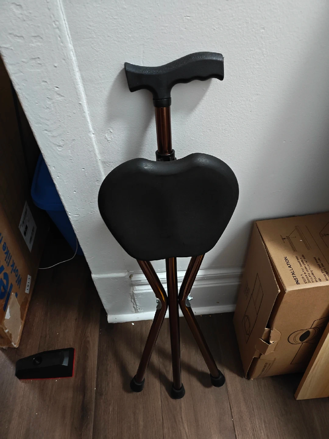 Selling a cane seat walking stick. It's in new condition and ready to go! The seat is black and the cane has a copper tone. A great aid for anyone who needs a little extra support while out and about