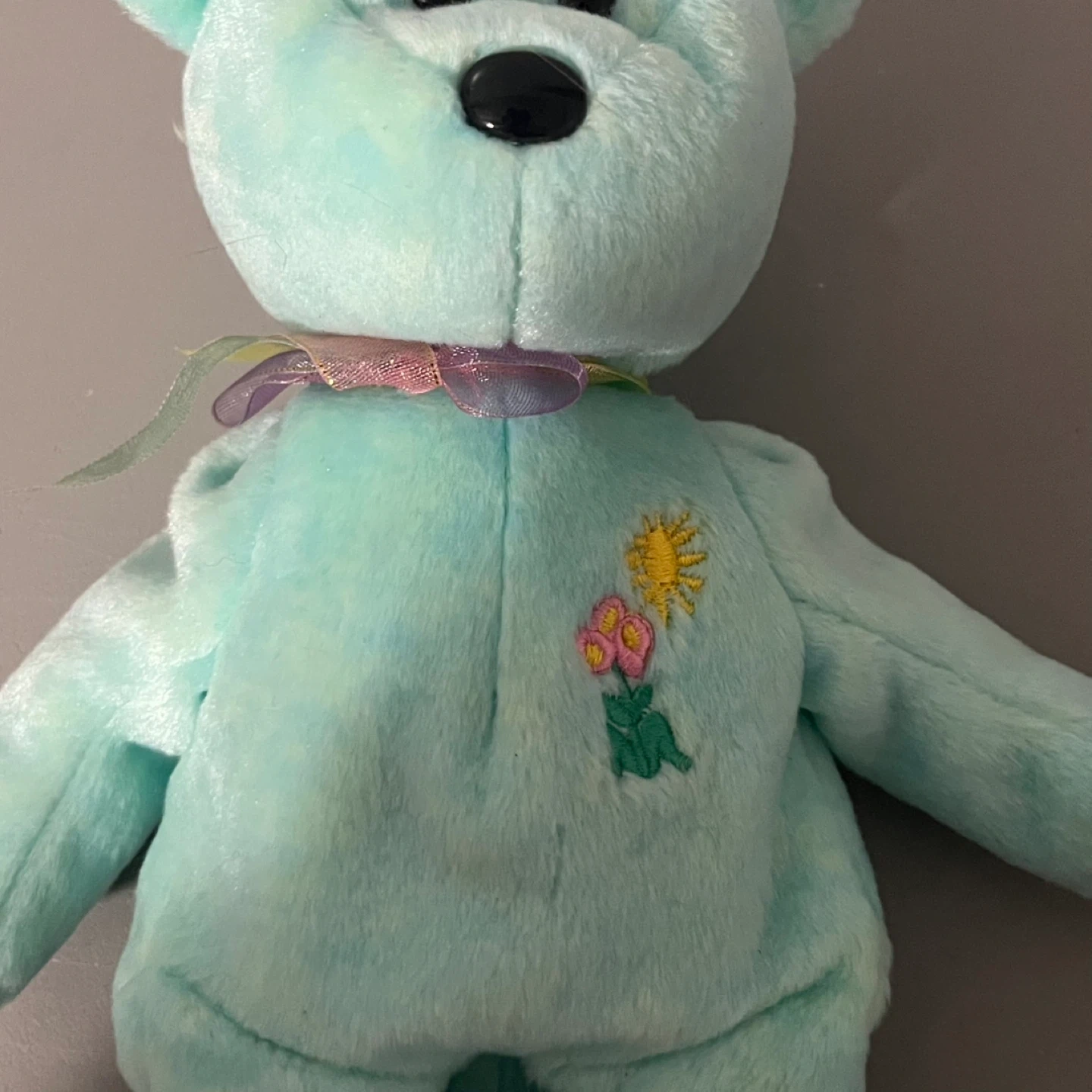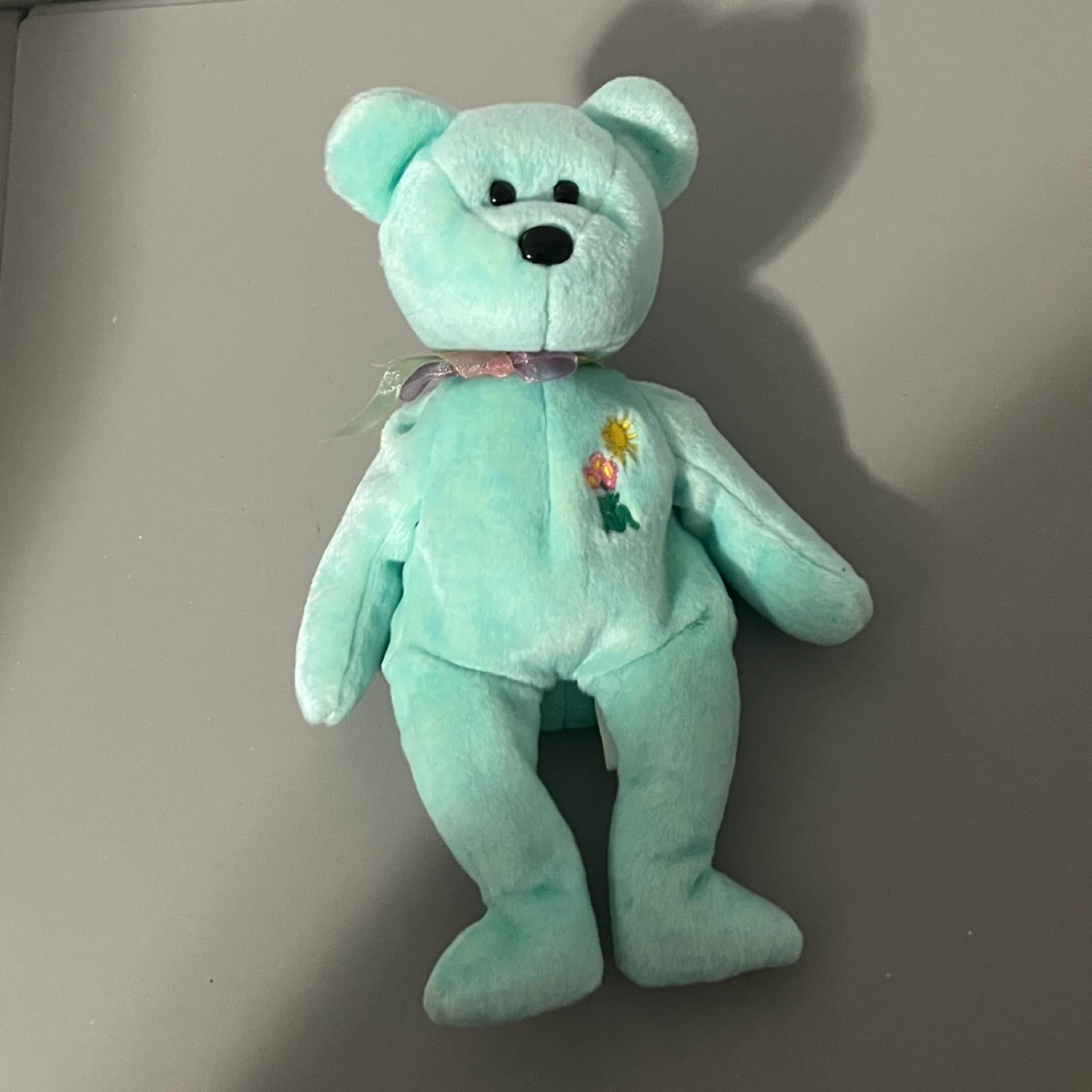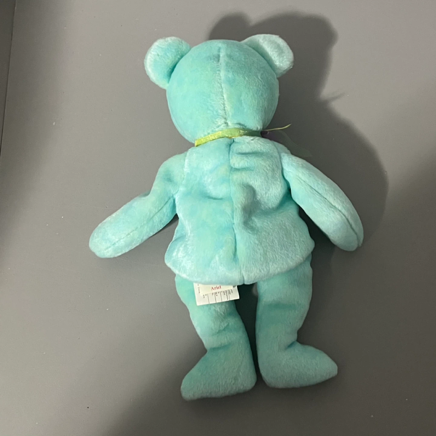 Selling a light blue Ty Beanie Baby bear named Ariel! It has a cute flower design on its chest and a ribbon around its neck. It's in great condition and ready for a new home