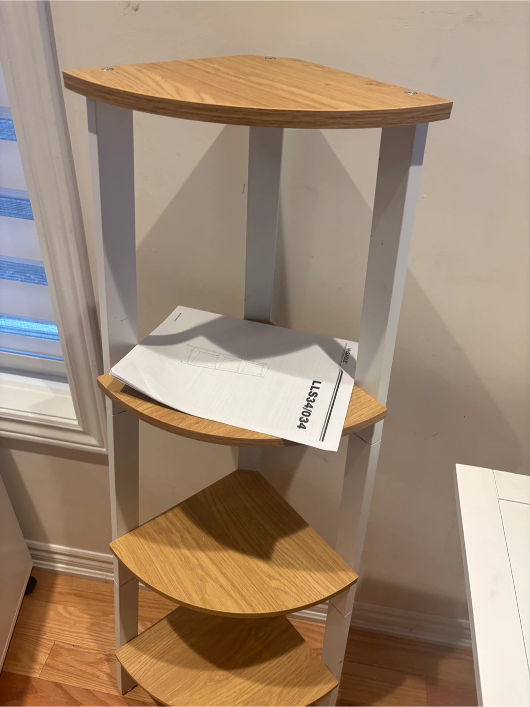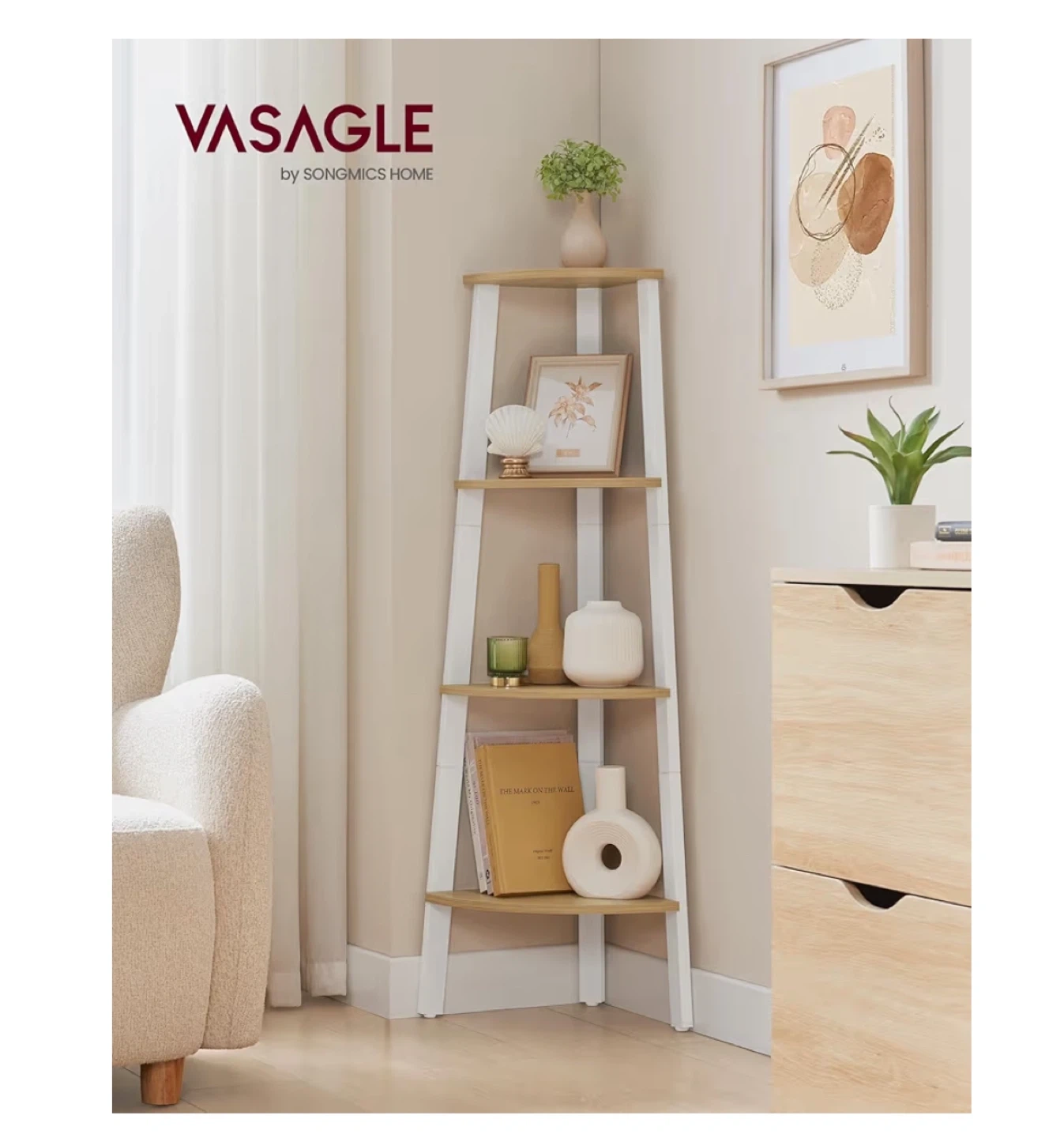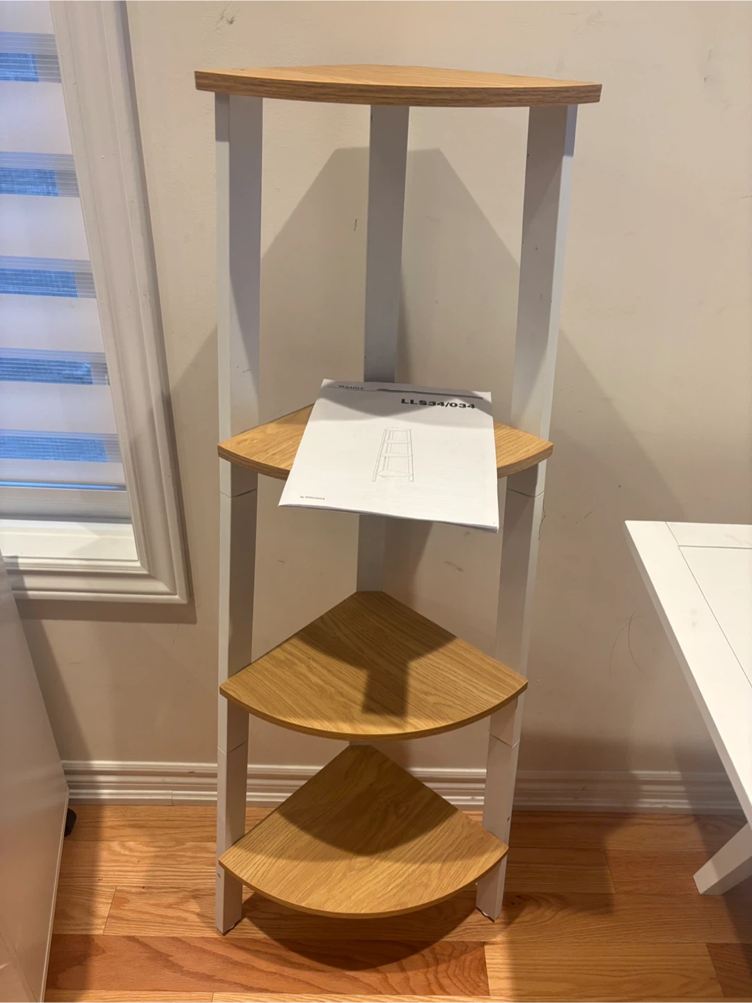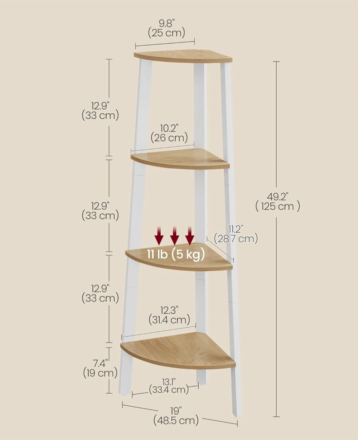 226This VASAGLE corner shelf is perfect for adding some extra storage and style to any room! It features 5 tiers and a white and wood finish. The dimensions are 49.2" (125 cm) tall, with shelves ranging from 9.8" (25 cm) to 13.1" (33.4 cm) in width. It can hold up to 11 lb (5 kg)available for pickup and delivery.