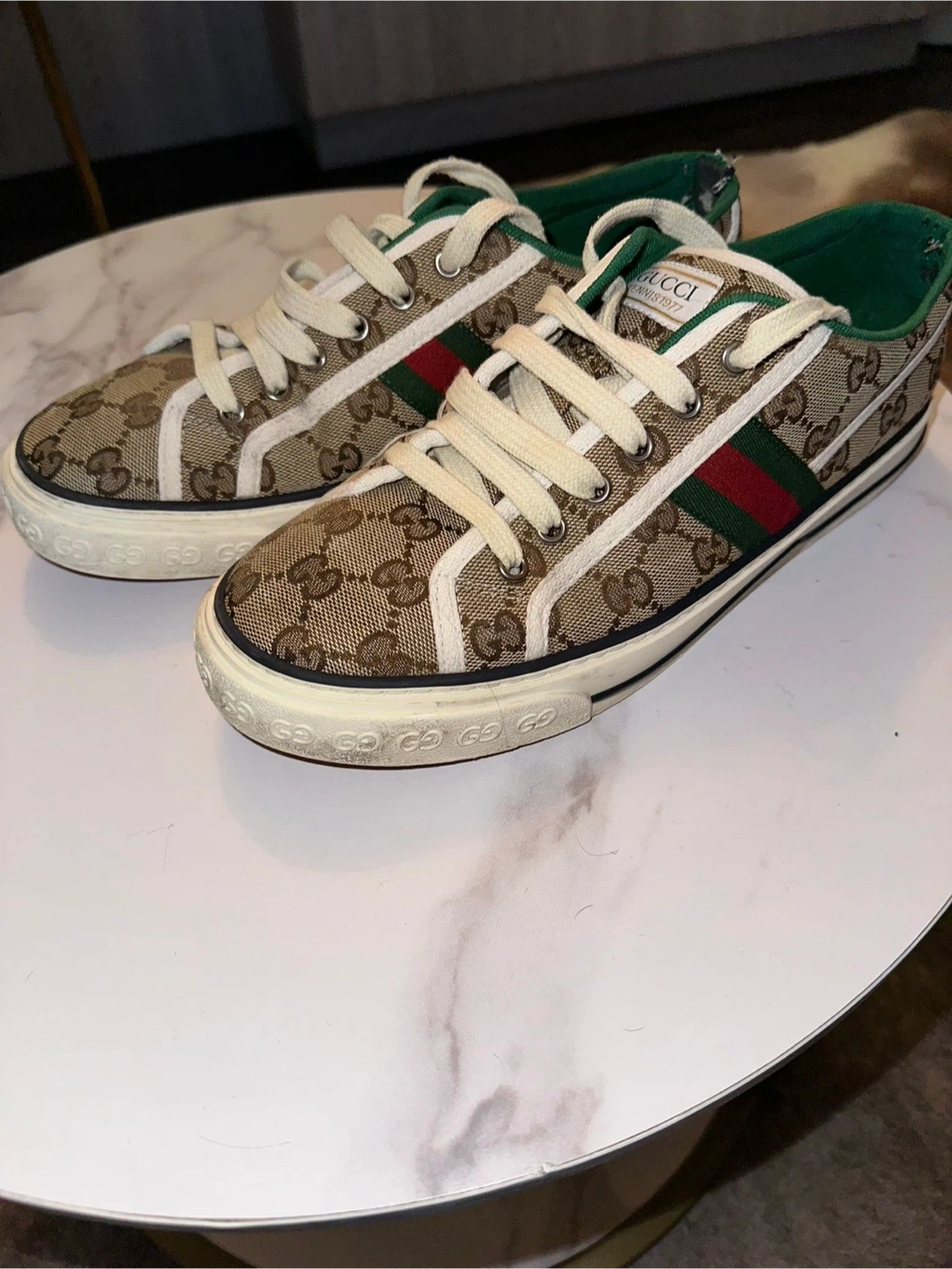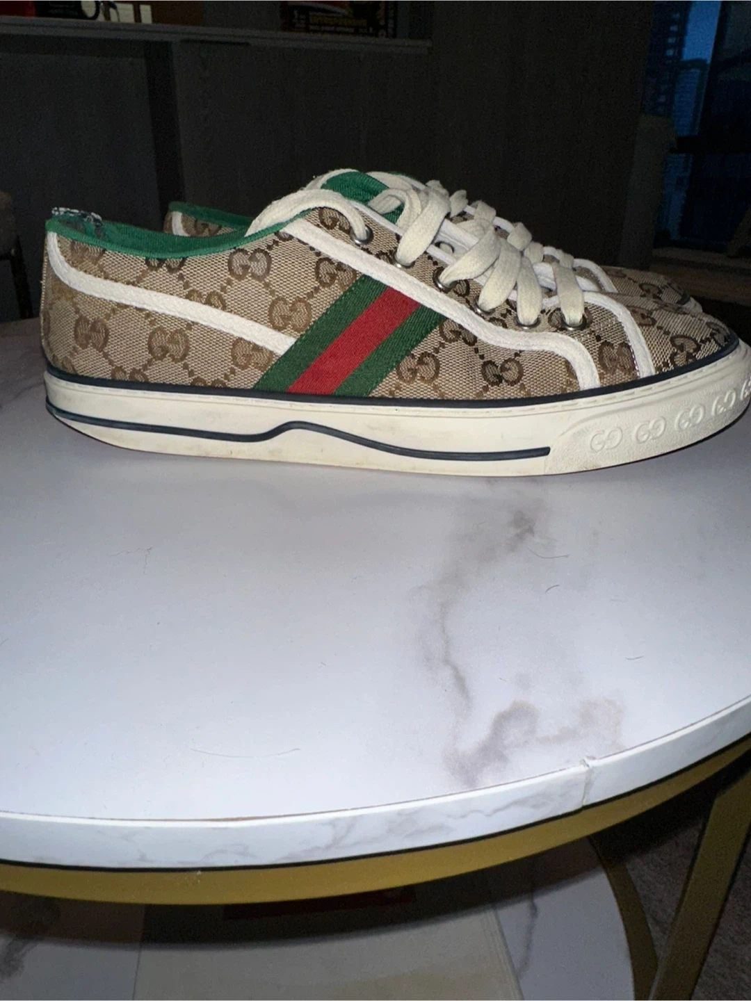 Selling a pair of Gucci sneakers. They have the classic Gucci pattern with the green and red stripe. They are in good condition with some signs of wear.