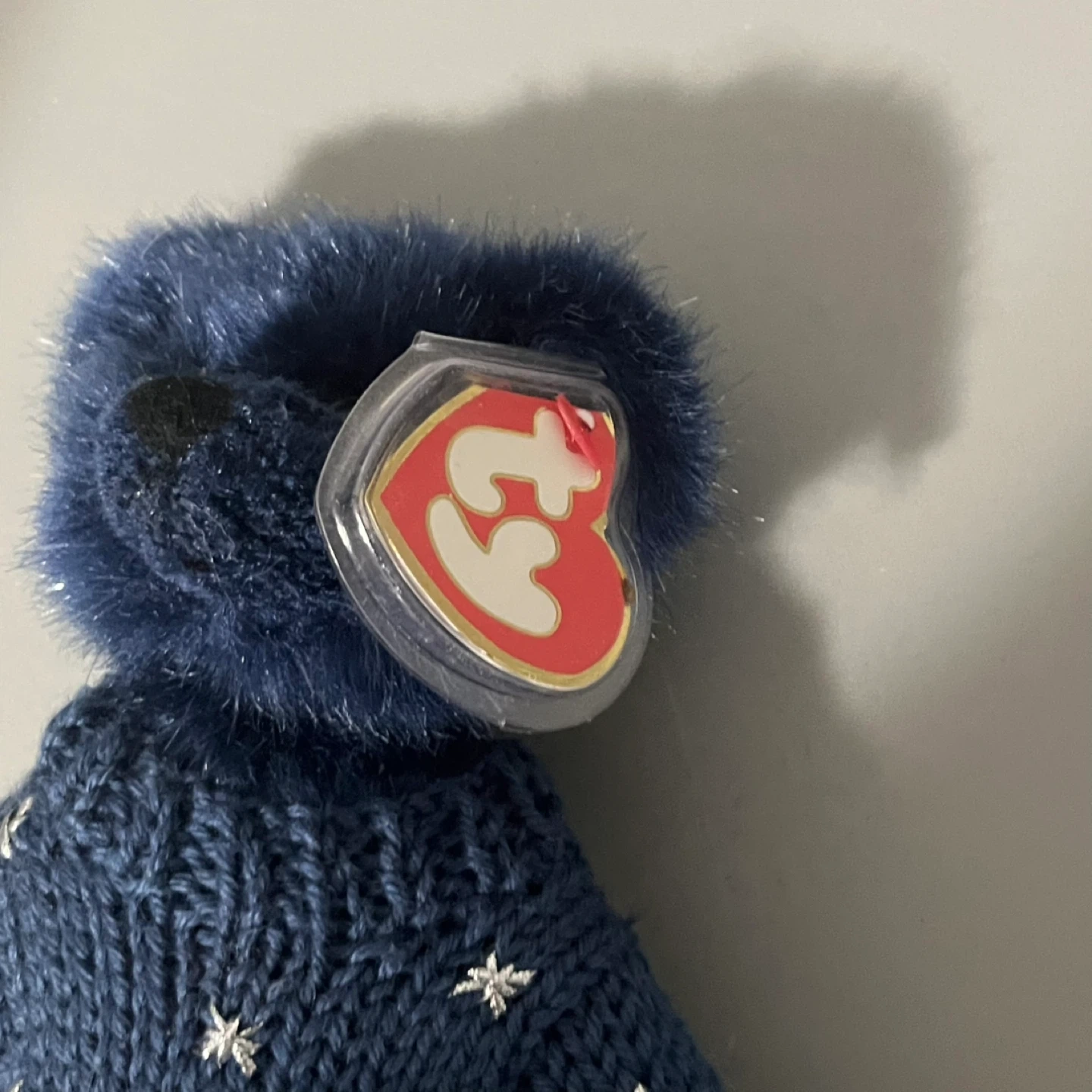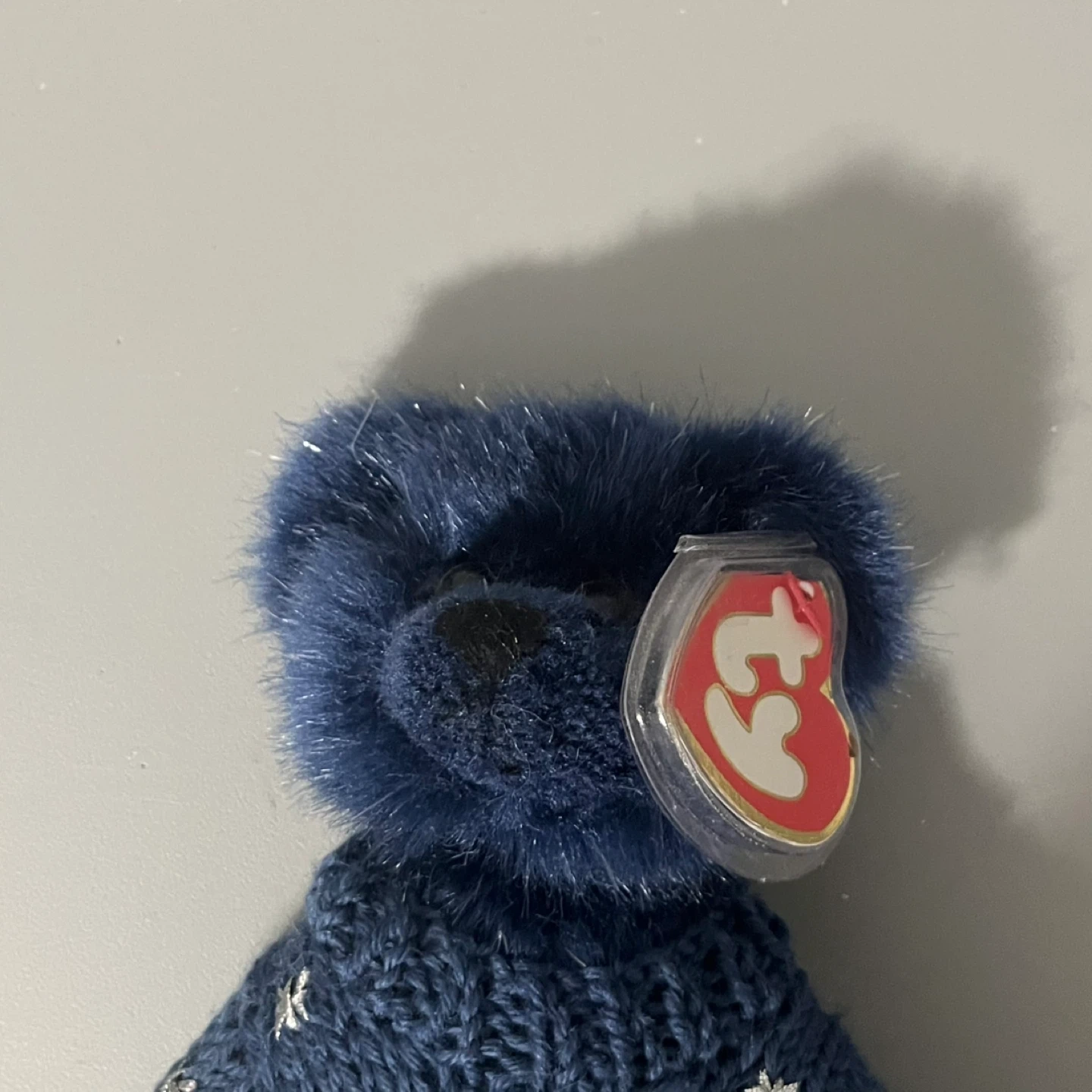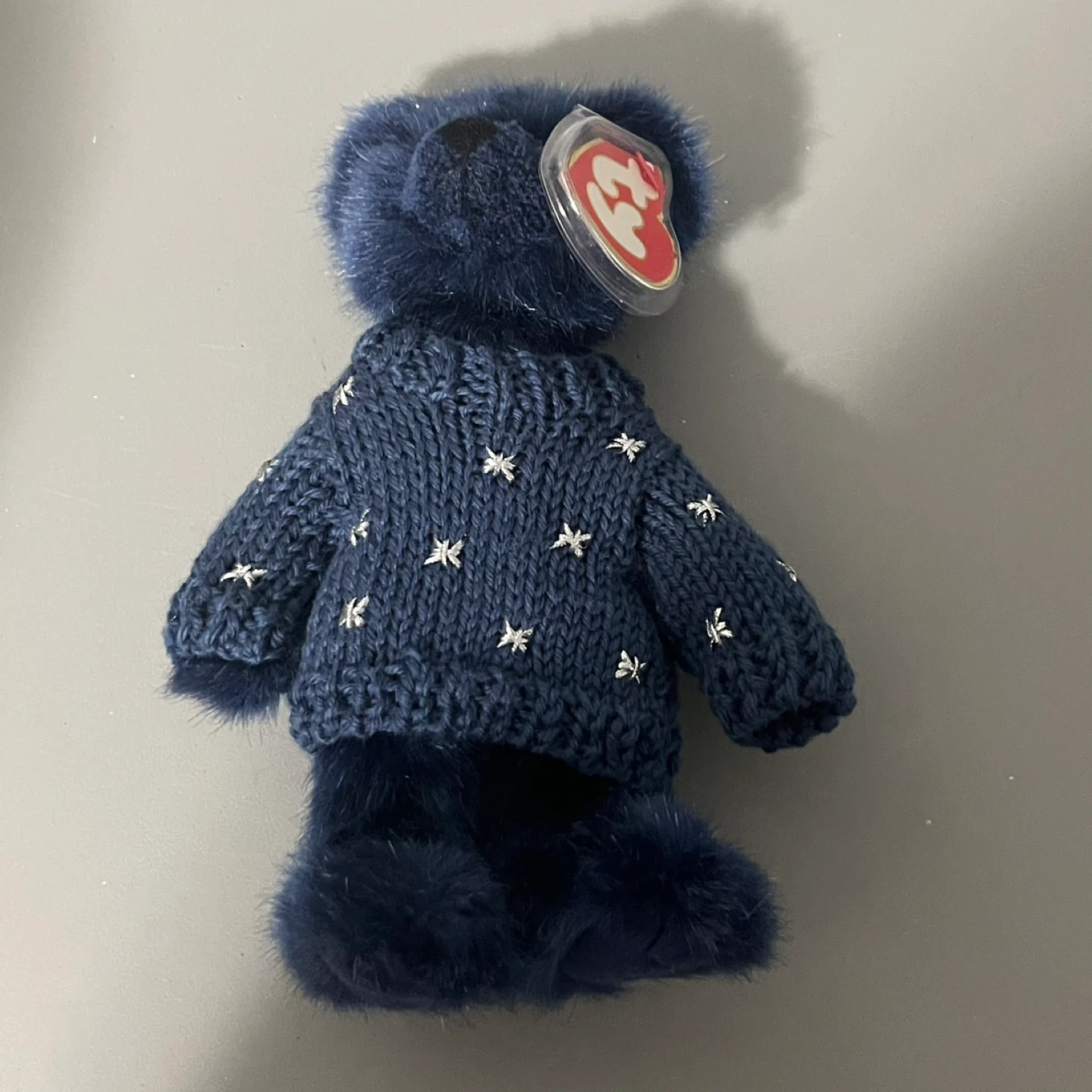 Selling a Ty Beanie Baby named Midnight the Bear! It's in great condition and comes with a cute blue sweater with stars on it. Perfect for collectors or as a gift for someone special