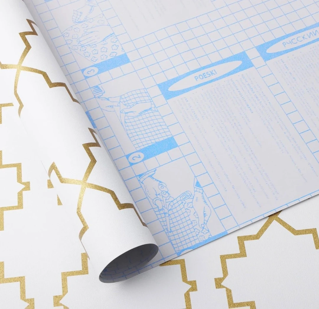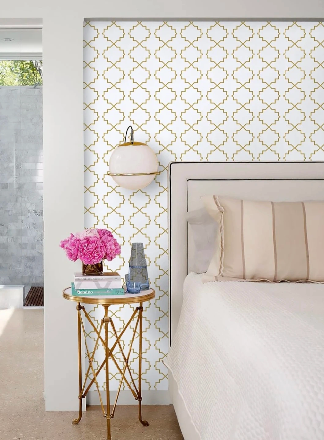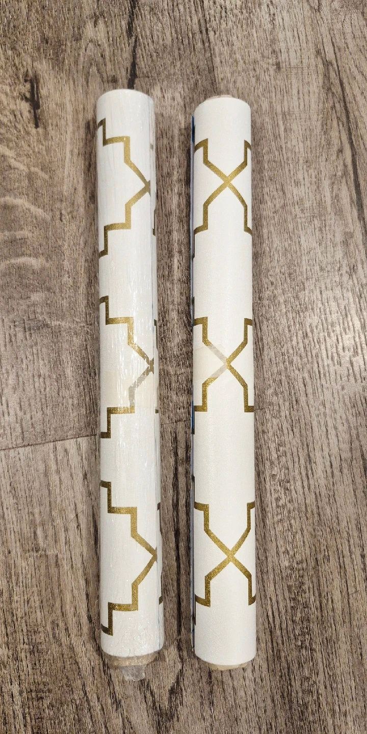 Add a touch of elegance to your home with this beautiful geometric wallpaper! The design features a stylish gold pattern on a crisp white background. Perfect for accent walls or a full room makeover! Set of 2 rolls. Each roll is 13"x78.7"
