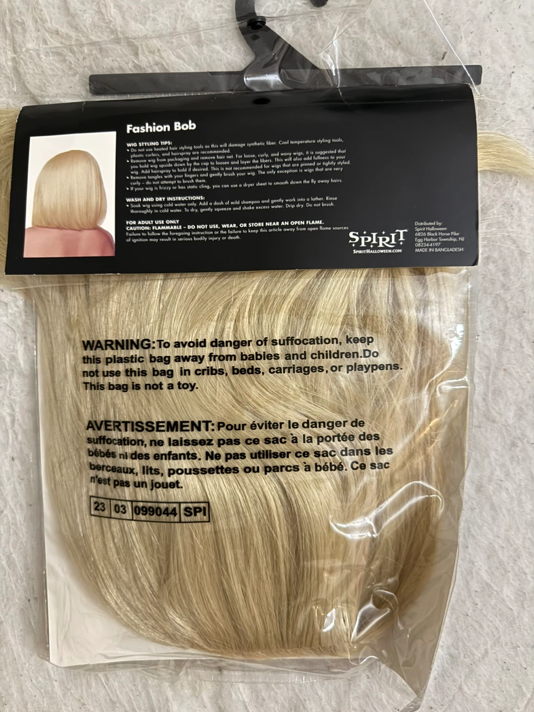 Selling a brand new Spirit Halloween Fashion Bob wig! It's a stylish blonde bob, perfect for costumes or just for fun. It's still in the original packaging, so it's in perfect condition. Originally bought for $24.99.