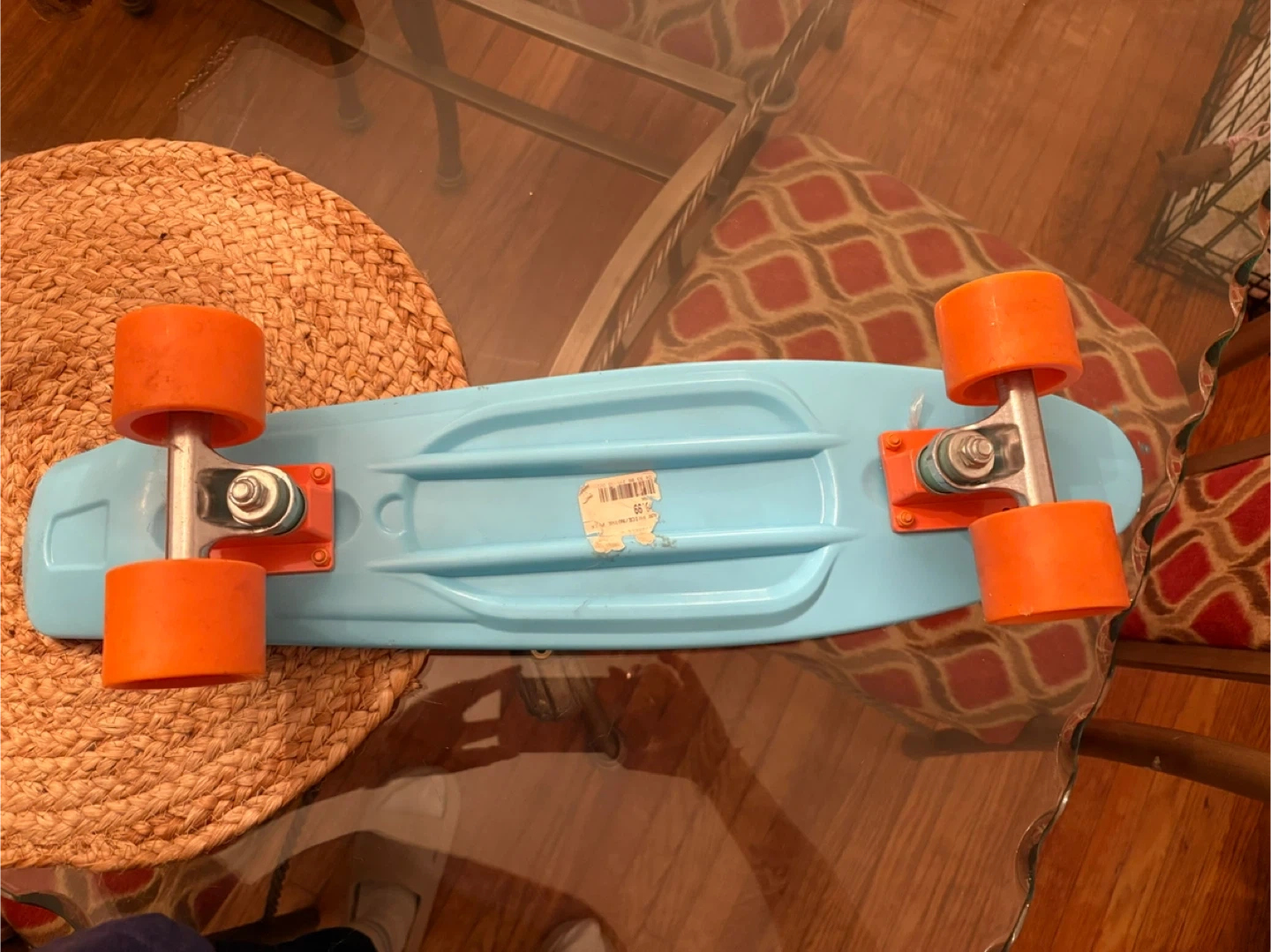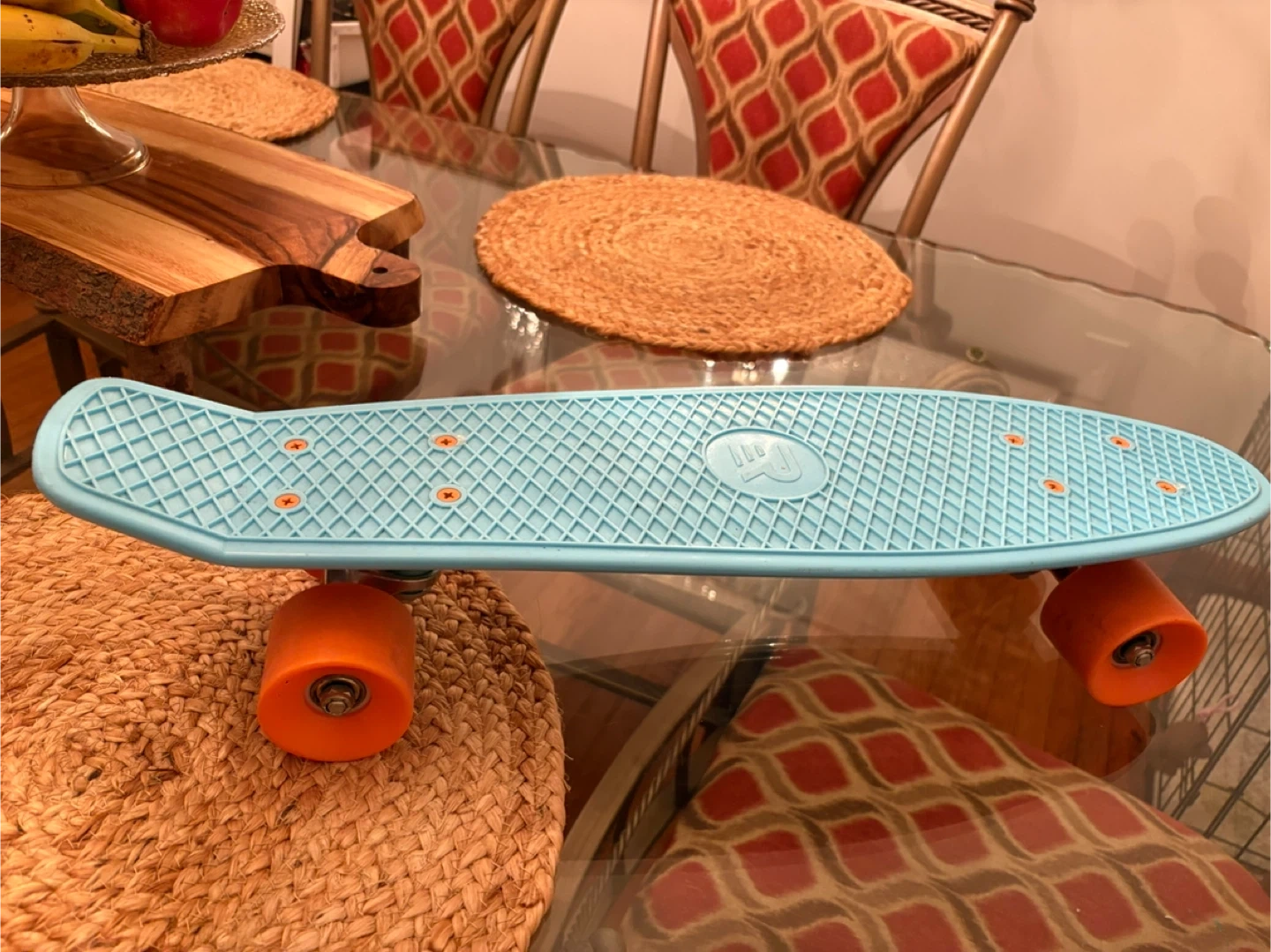 Selling a cool Penny board skateboard! It's in great shape and ready to ride. The deck is a nice light blue, and it has bright orange wheels that really pop. Perfect for cruising around town or hitting the park