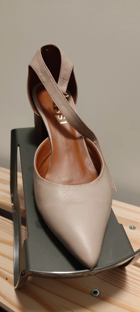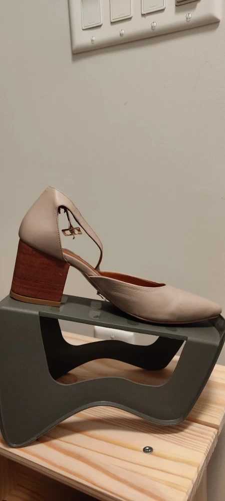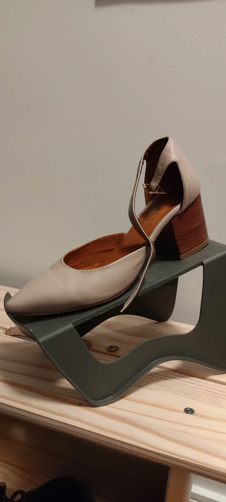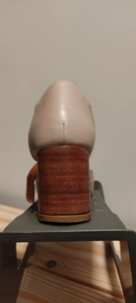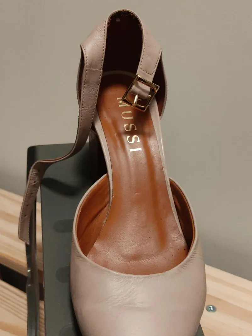 These are a pair of stylish beige ankle strap heels from MUSSI (Colombian brand specialized in sustainable real leather). They feature a wood-look block heel and a pointed toe. Perfect for dressing up or down!