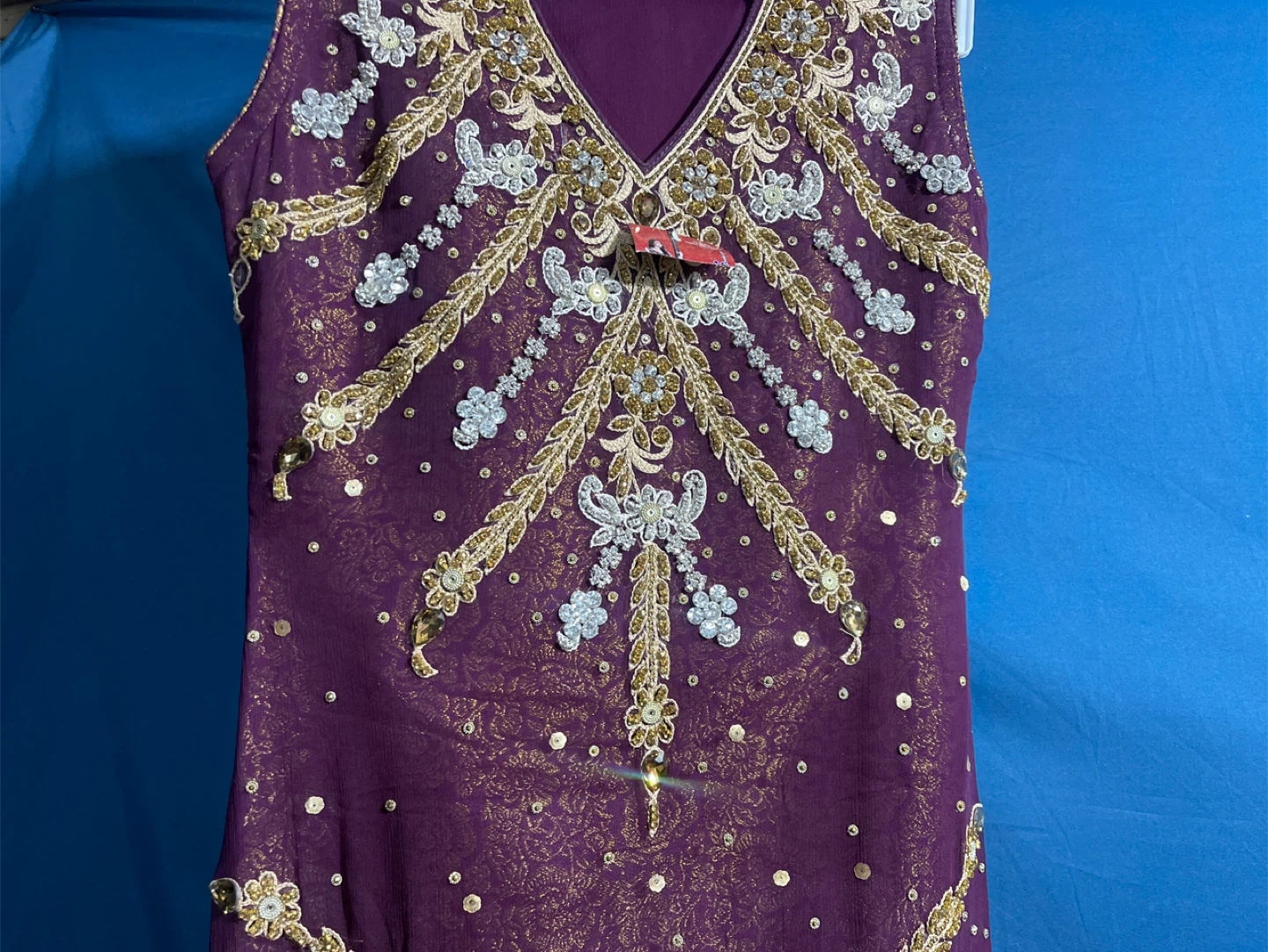 60Beautiful purple dress with gold embroidery details! It's in great condition and perfect for a special occasion or just to add a little sparkle to your day