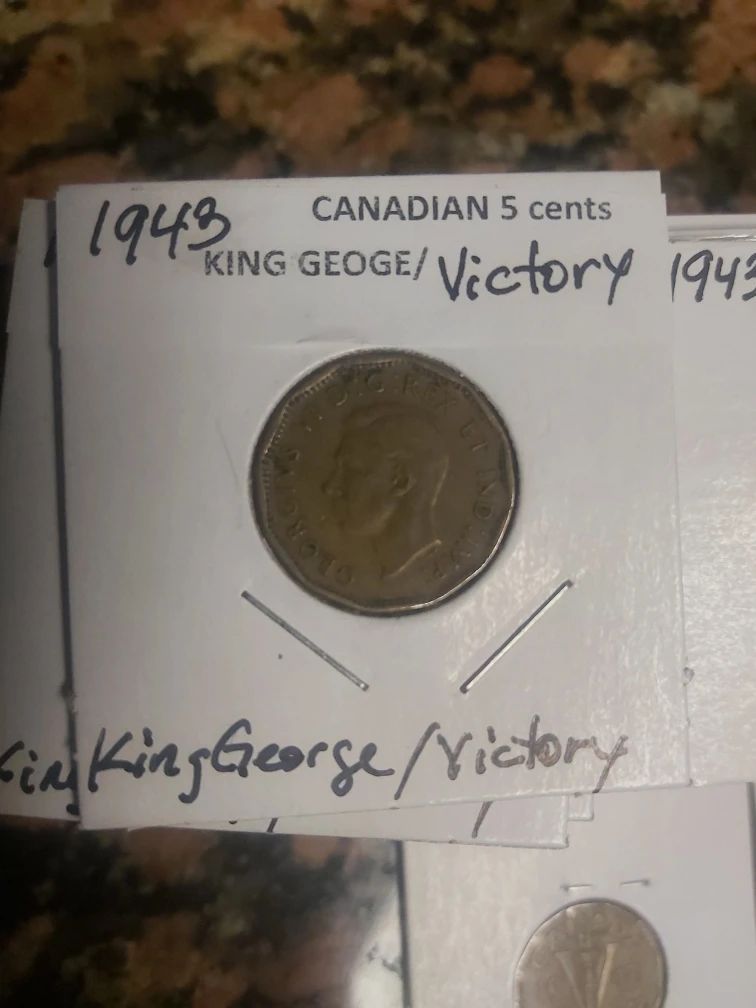 Selling a 1943 Canadian 5 cent coin, also known as the "Victory" "TOMBAC" nickel. It features King George VI on one side and a "V" for victory on the other. A piece of Canadian history!