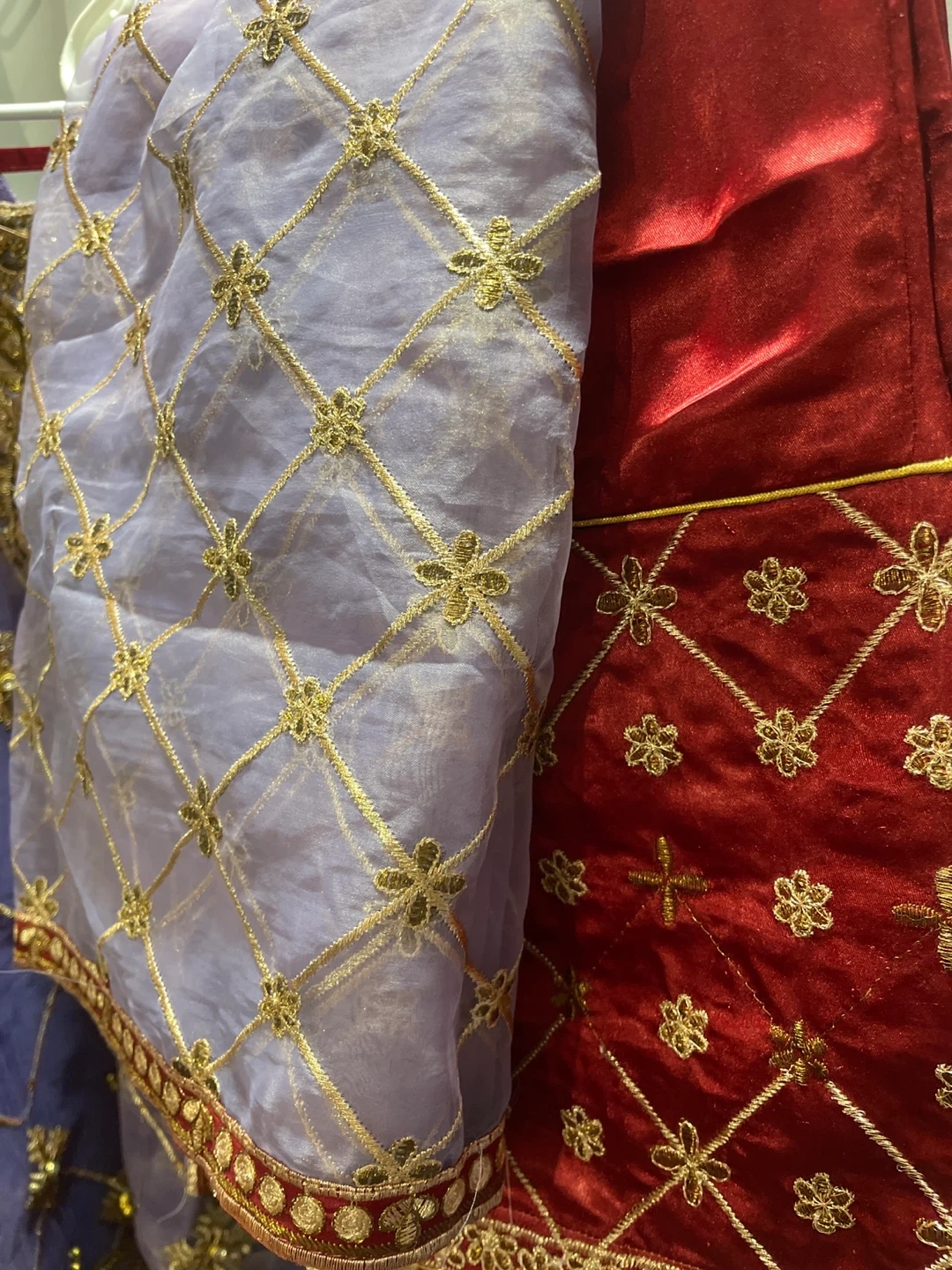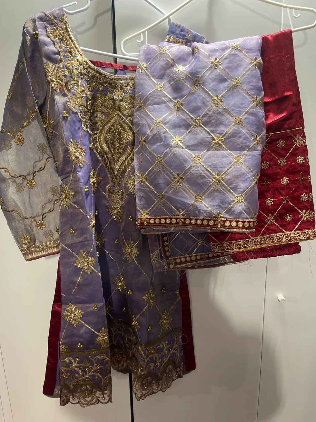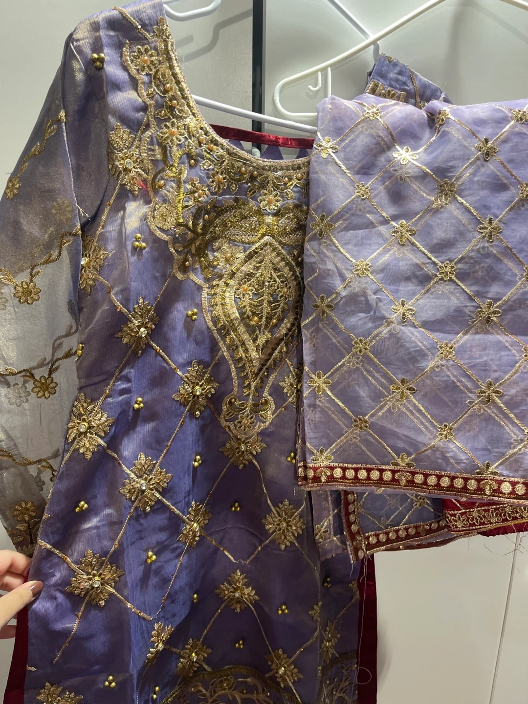 60Beautiful purple and gold shalwar kameez with intricate embroidery. This outfit includes the kameez (top), shalwar (pants), and dupatta (scarf). Perfect for special occasions!