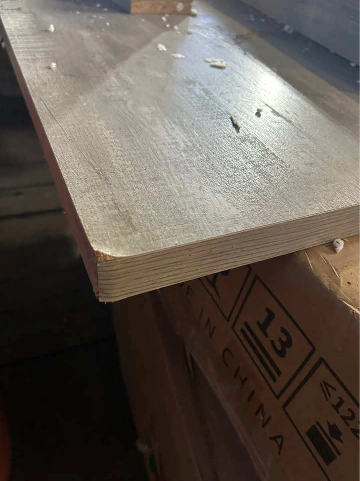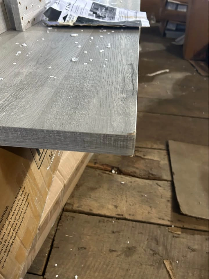 24Reclaimed wood look dining table in a trending gray wash finish with thick, block-style legs. The robust panel construction of the gray reclaimed look table top makes for the perfect farmhouse dining table. Sits up to 4 people. Compact size fits perfectly in a casual or formal dining area in small homes, apartments or condos. Product Dimensions: 47 Inch L x 32 Inch D x 31 Inch H Note: Two corners have some slight damage from shipping. Price reflects this. Item is located in Port Robinson and if its listed its available.