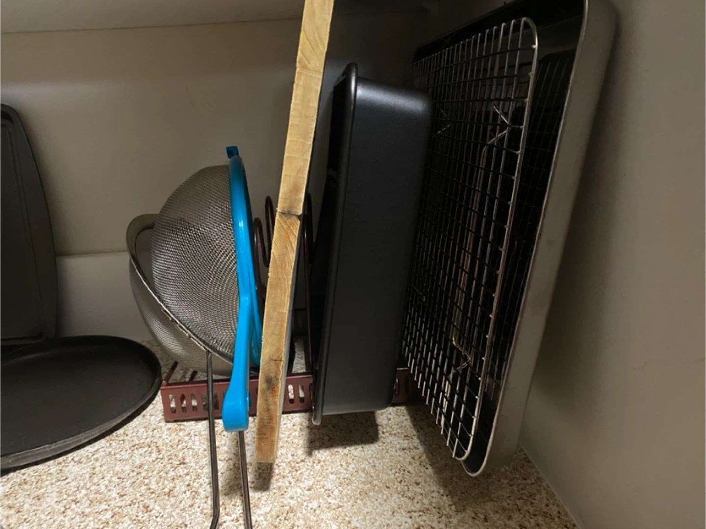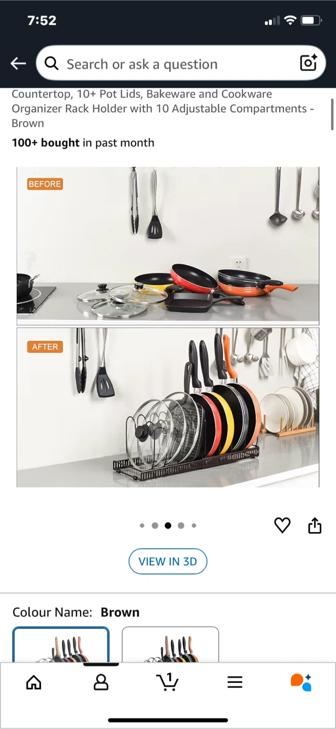 Selling a organizer rack holder for pot lids, bakeware, and cookware. It features 10 adjustable compartments and comes in brown. It's great for keeping your kitchen organized!