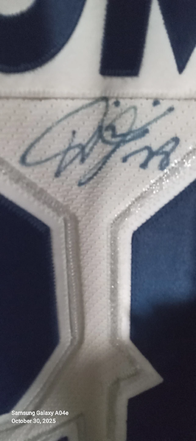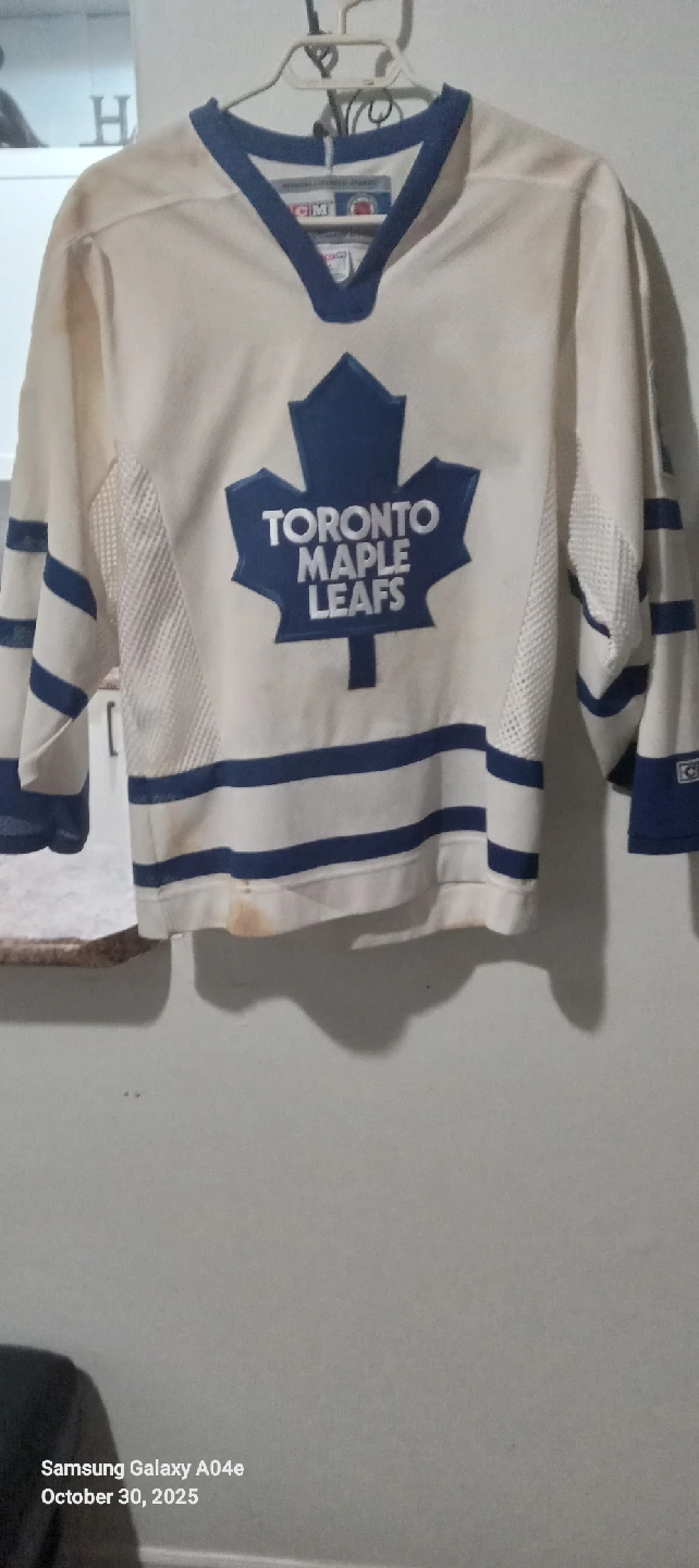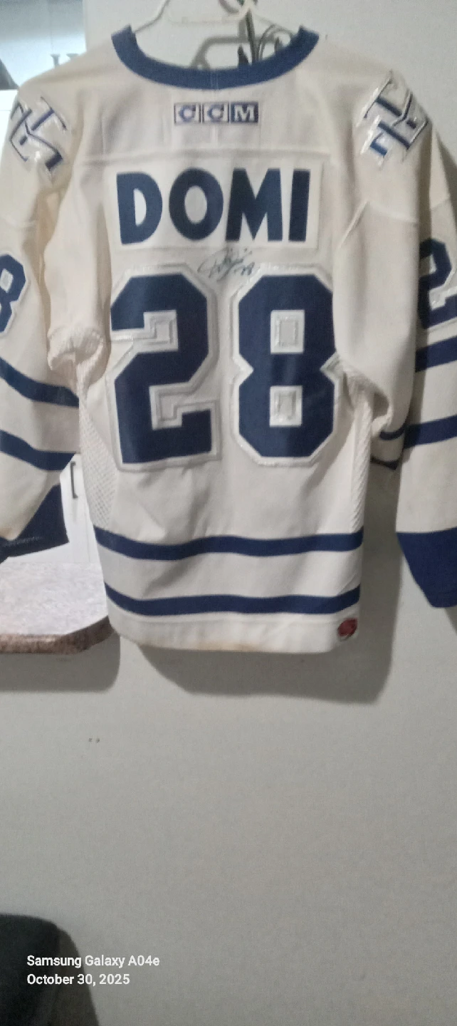 Selling a Toronto Maple Leafs hockey jersey, CCM brand, with Domi and the number 28 on the back. There's a signature on the front, and some staining is visible.