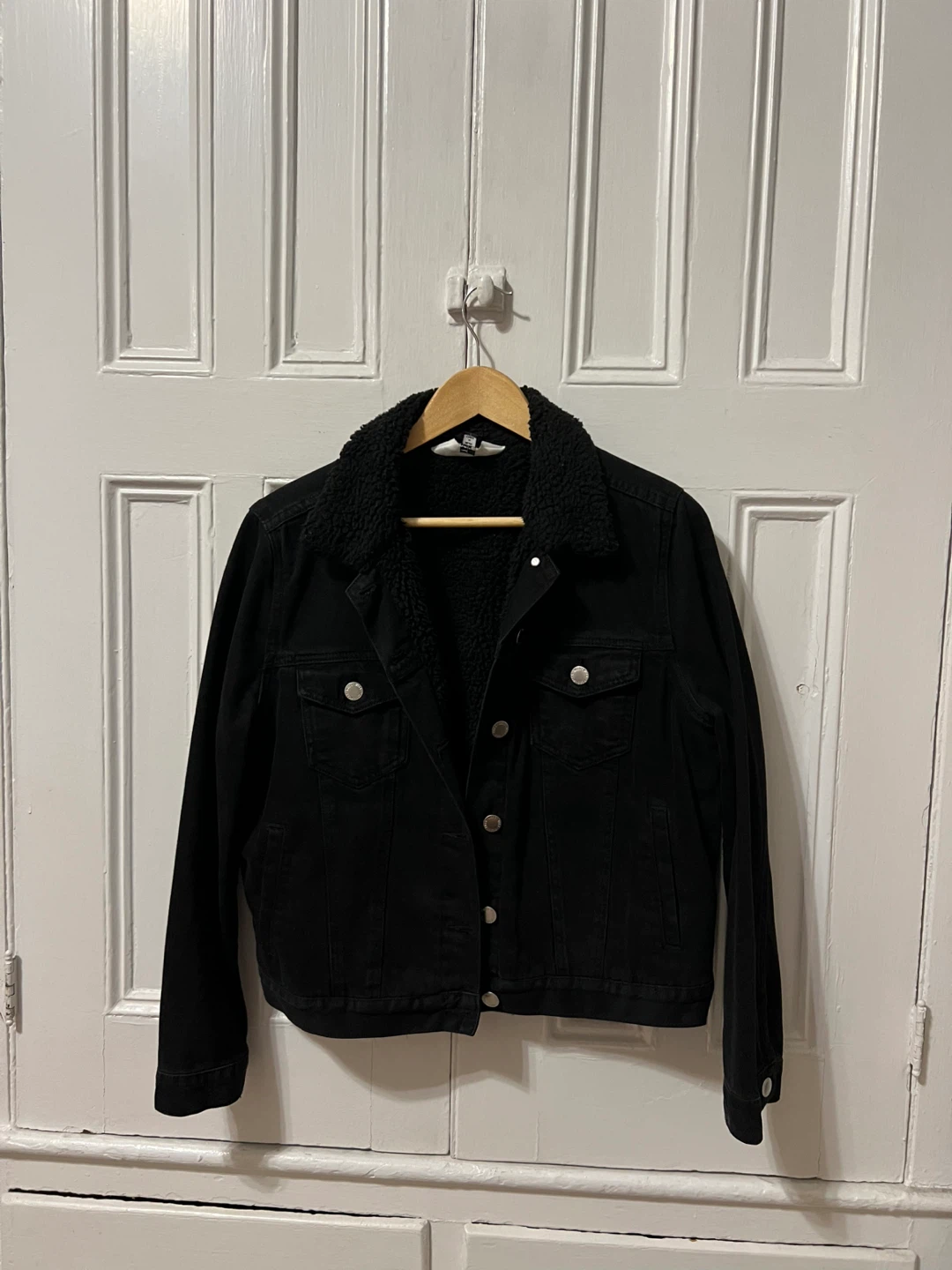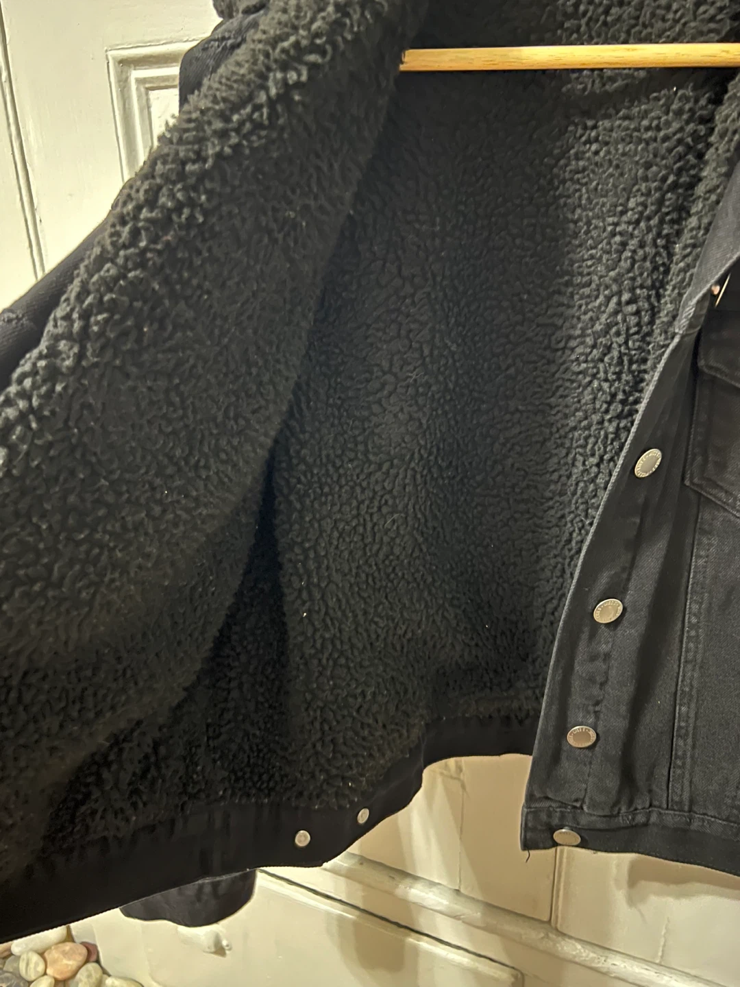 This is a black denim jacket with a cozy full sherpa lining. It's perfect for adding a bit of warmth and style to your outfit. The jacket features a classic denim design with a soft sherpa collar and lining, making it a great layering piece for cooler weather. 4 pockets. Perfect for layering in the colder months classic chic style. Looks more black in real life than it does in the photos.