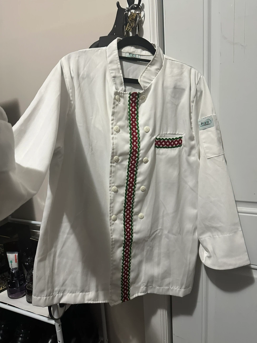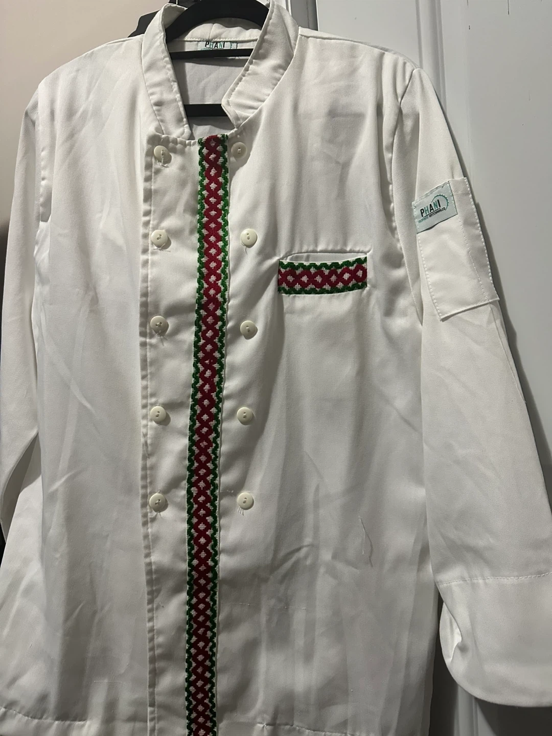 Selling a white Phani chef coat. It features a decorative red and green pattern down the front and on the pocket. Perfect for any aspiring or professional chef