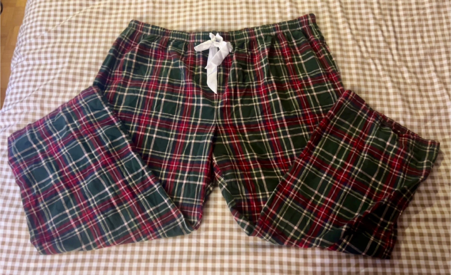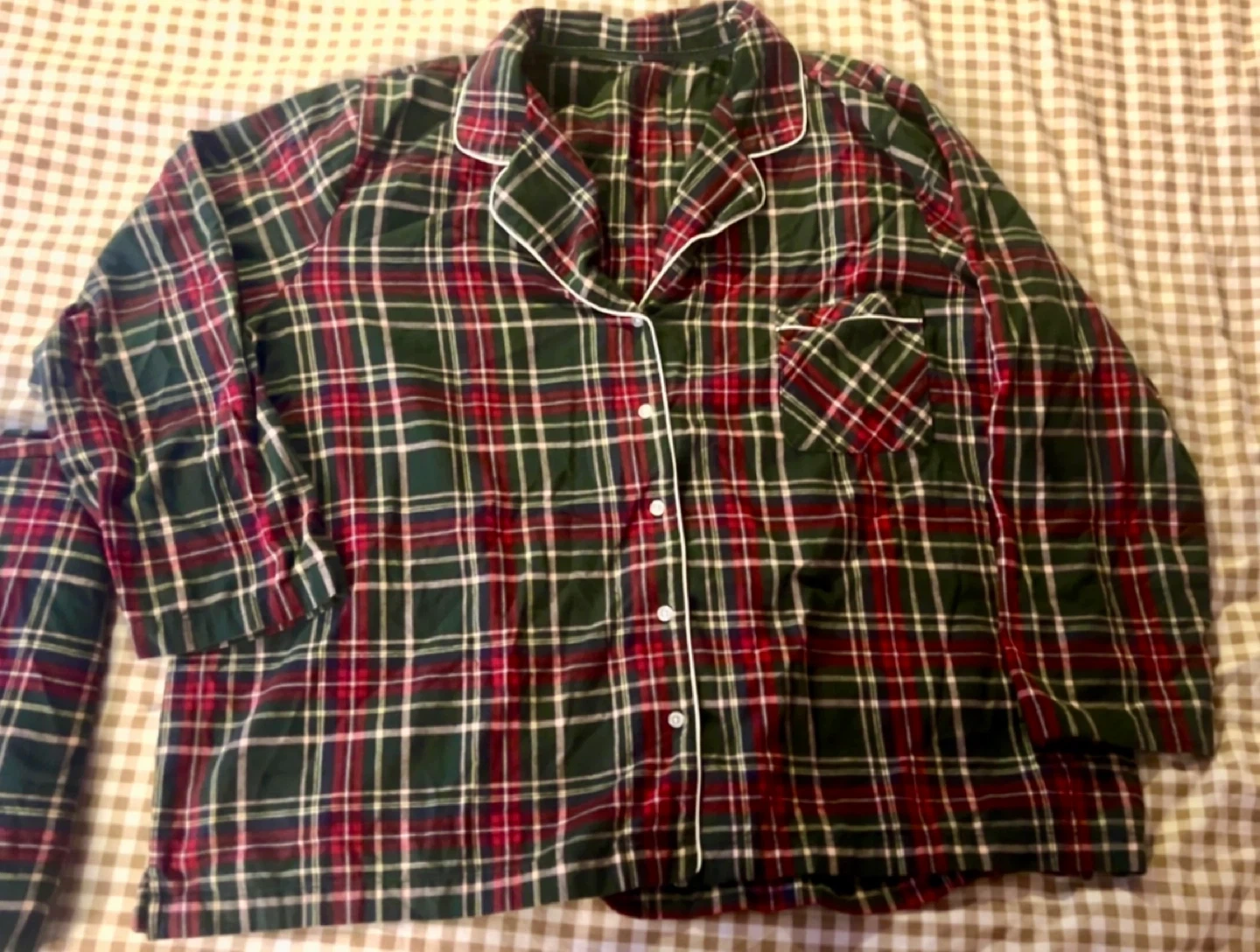 Cozy plaid pajama set, includes both the top and bottom! The set features a classic plaid pattern in red, green, and white. Perfect for a comfy night's sleep or lounging around the house. Worn twice, like new condition.