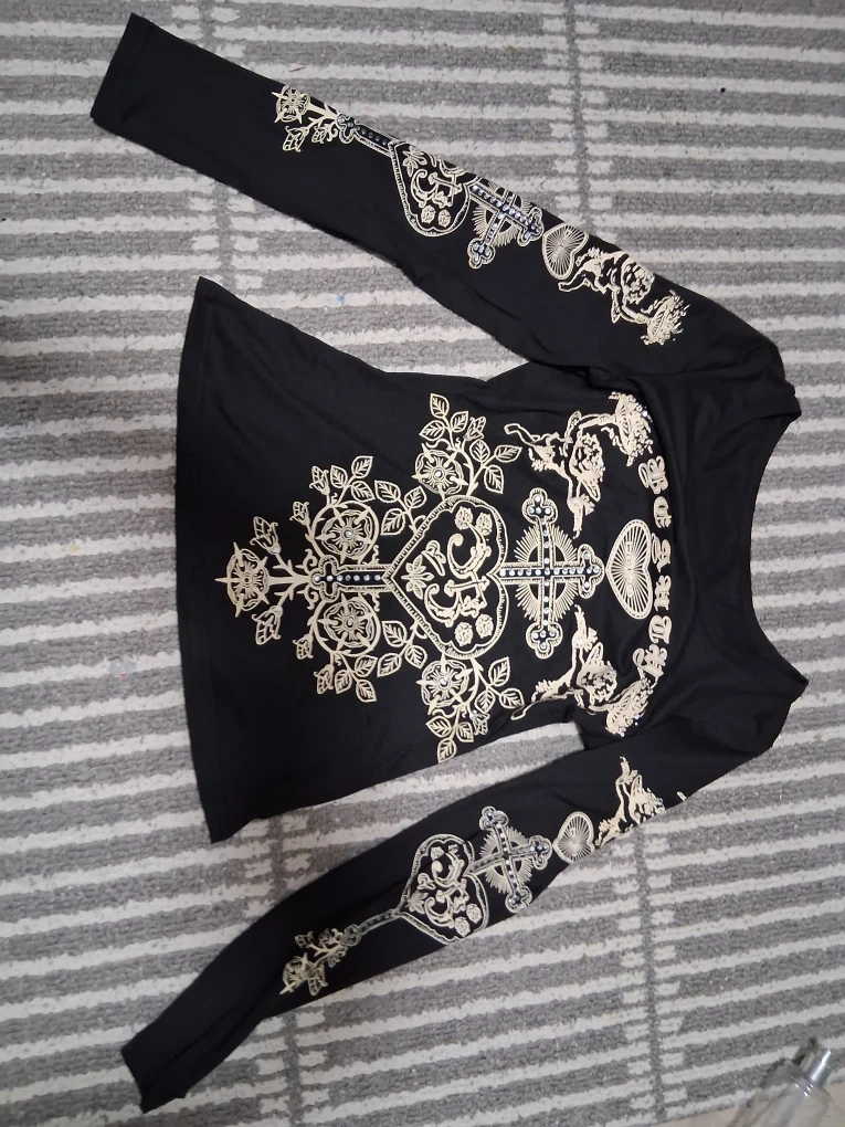 Selling a black long sleeve top from XXI in size medium (M). The top features a unique graphic design. It's in great condition and ready for a new home!