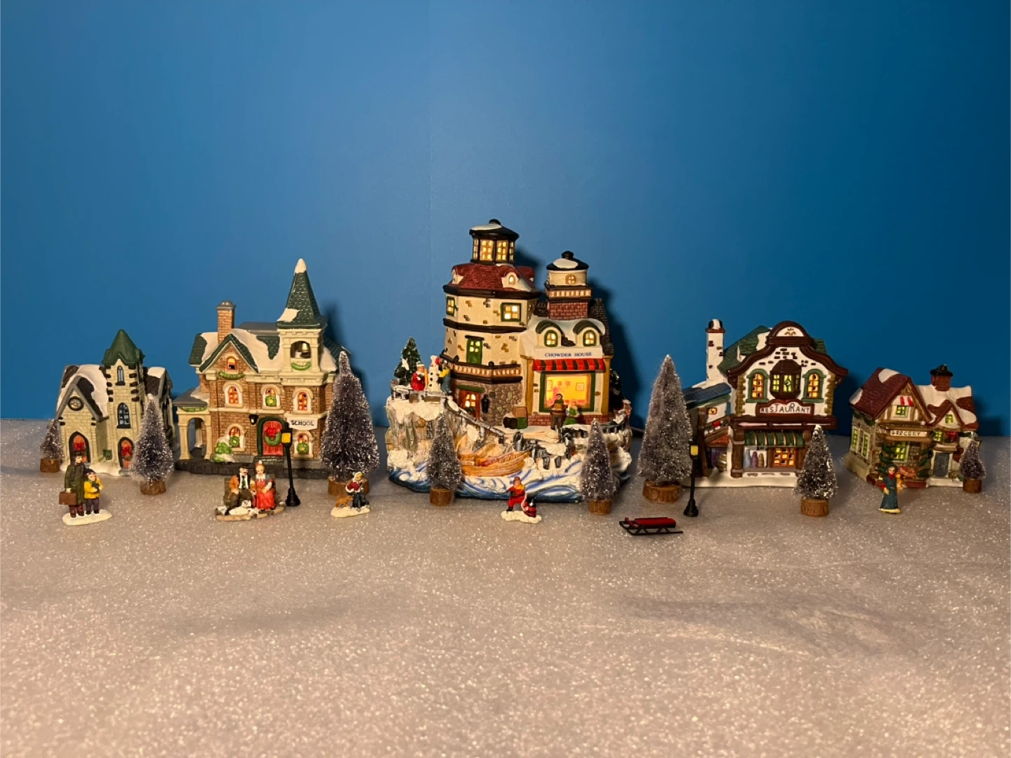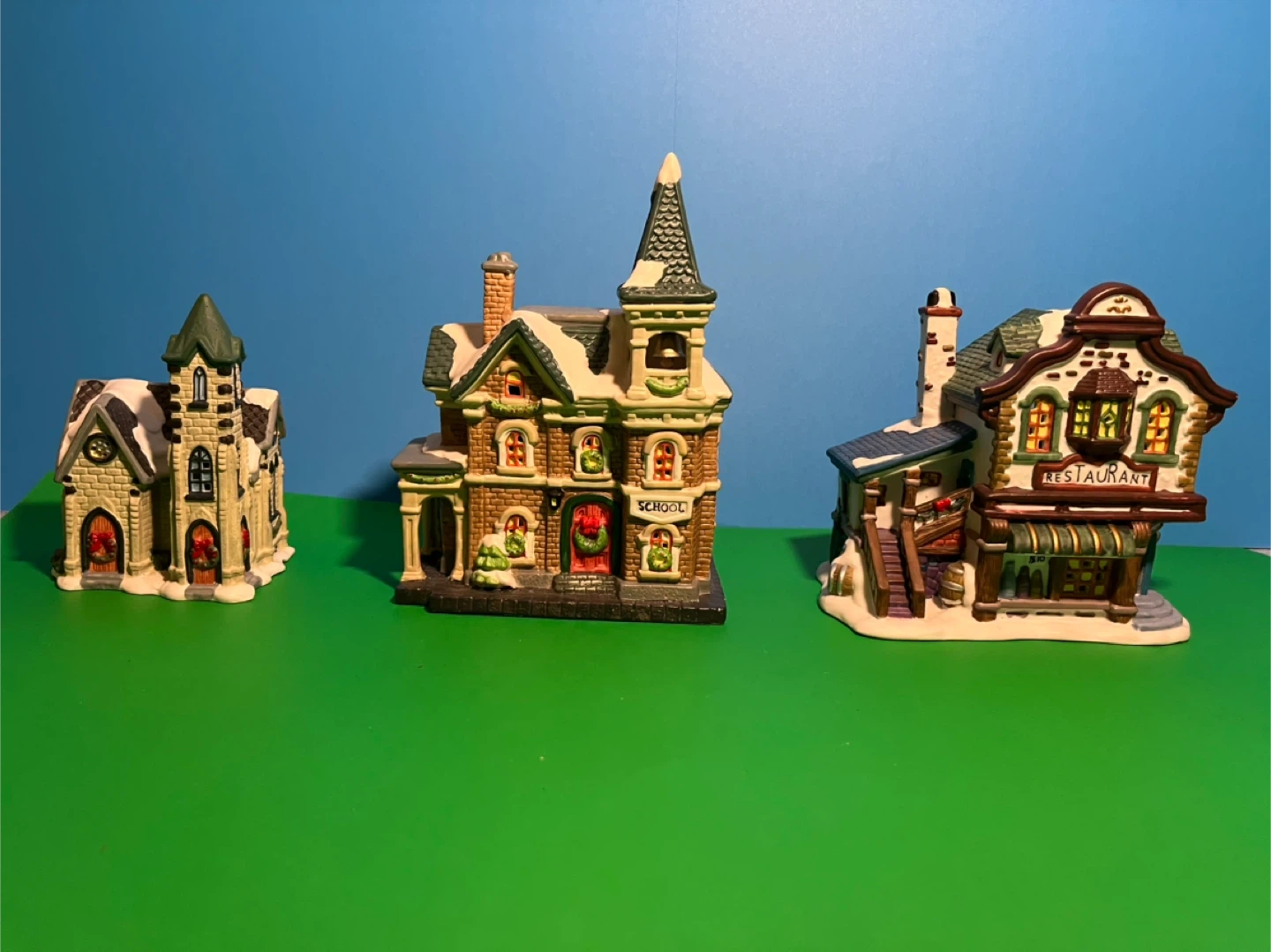 Selling a collection of Department 56 Christmas village buildings. They're in good shape and ready to add some festive charm to your holiday display! Includes a church, school, restaurant, grocery store chowder house one cord with lightbulb and 18 small accessories.
