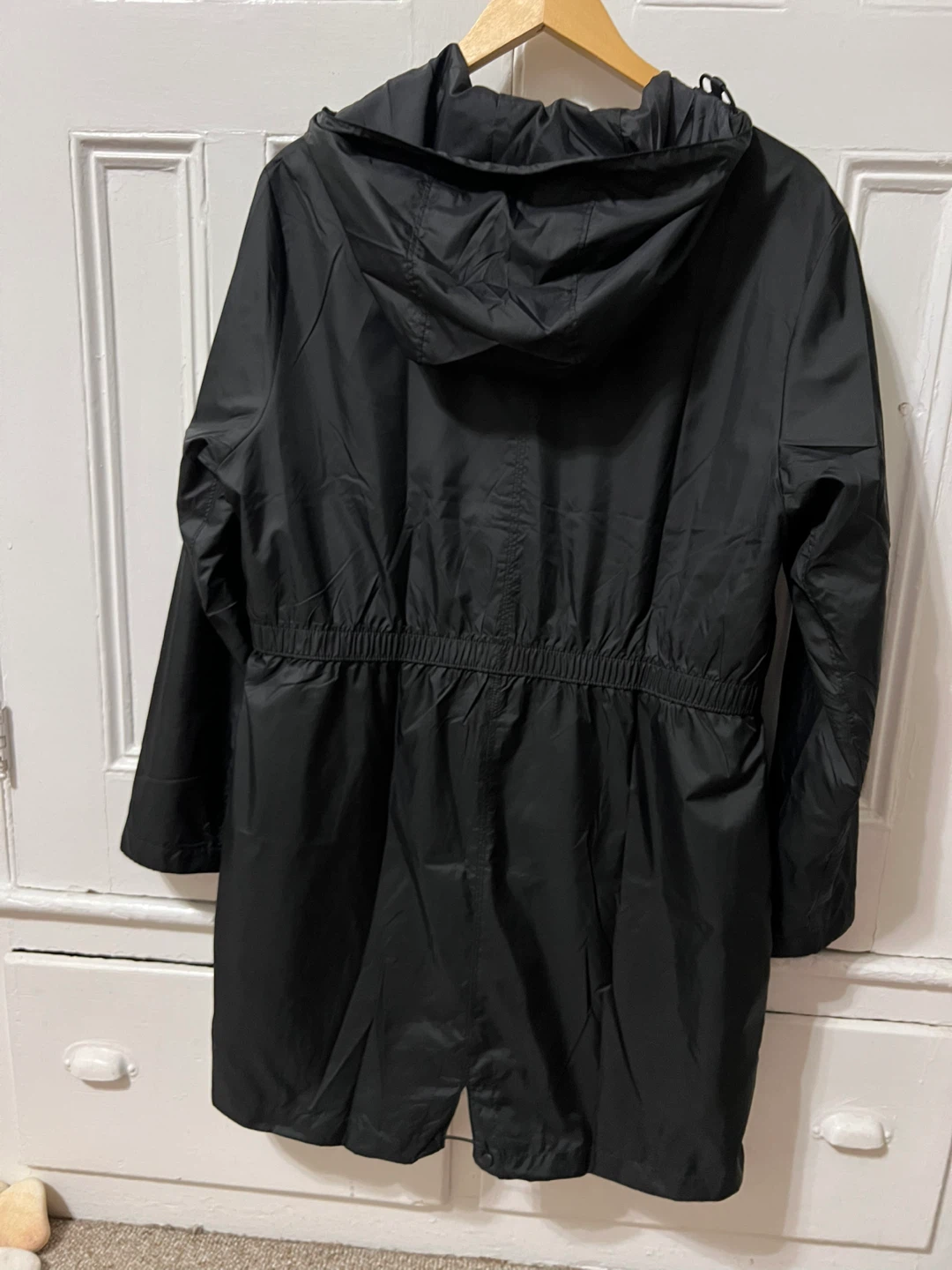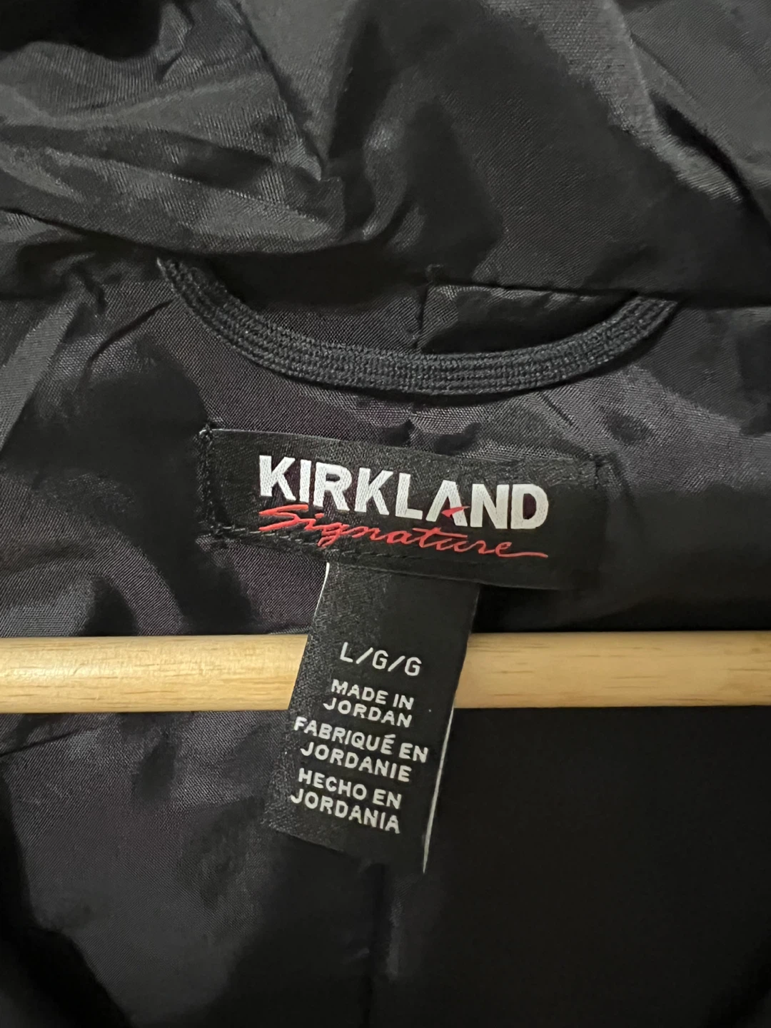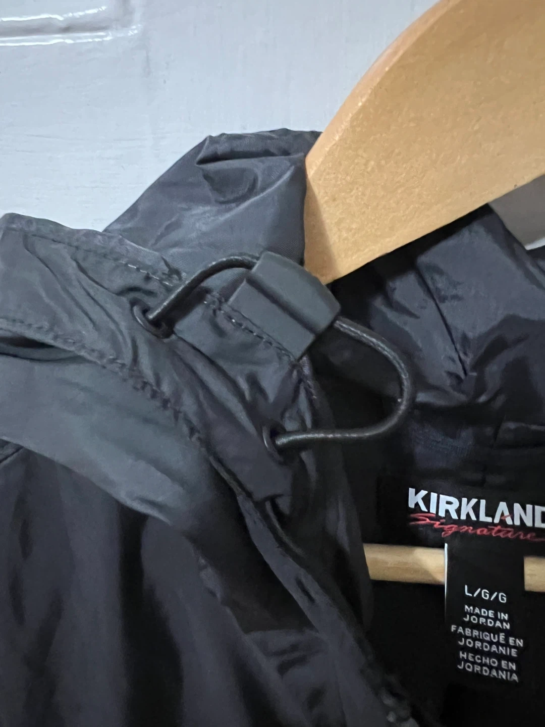 Selling a Kirkland Signature rain jacket in black, women’s size L. It's in great condition and perfect for those rainy days! The jacket features a hood and zippered pockets. Never worn, no tags.