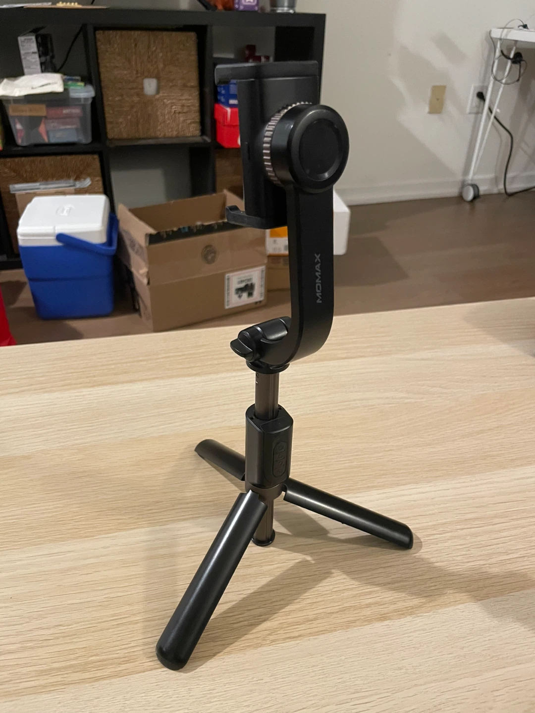 Selling a MOMAX selfie tripod in black. It's in great condition and ready for your next adventure! Perfect for taking photos and videos on the go