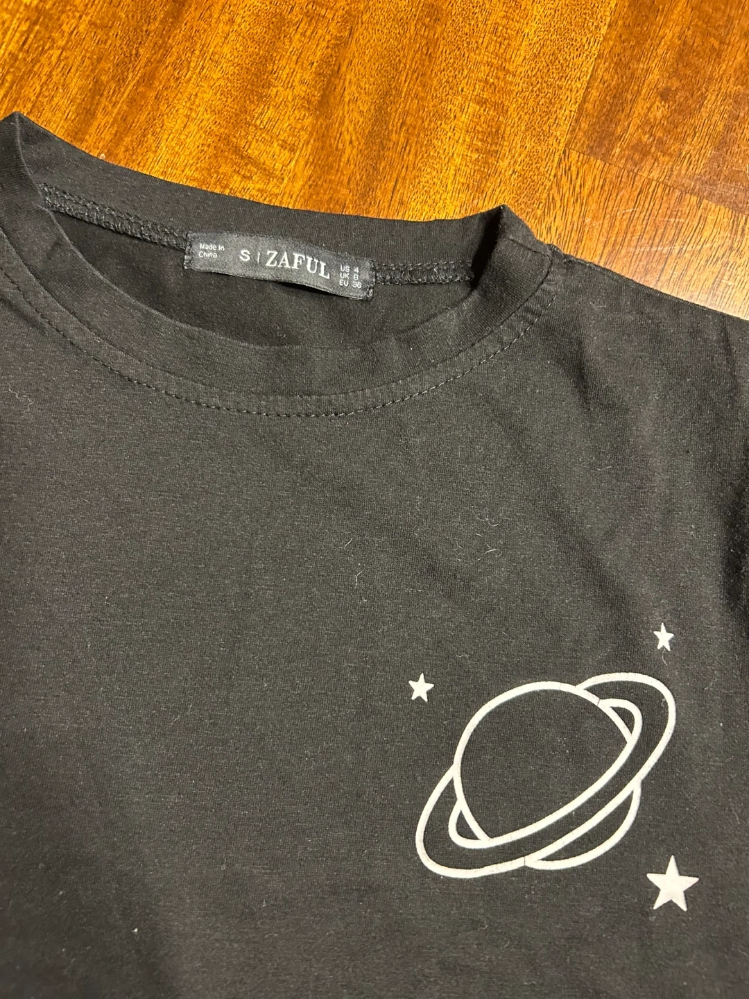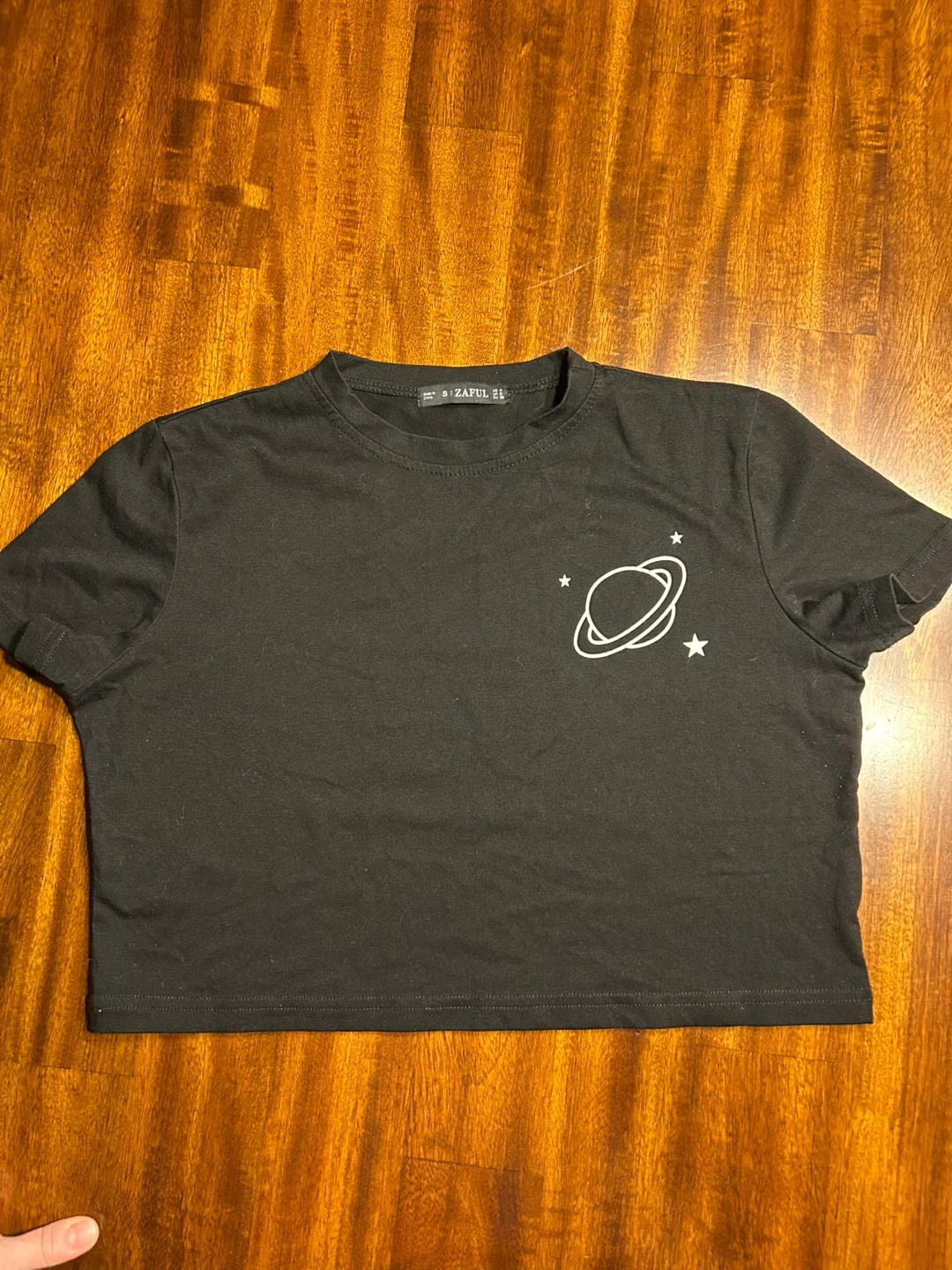 86Cute Zaful black graphic tee in size small! It features a simple planet and stars design. Perfect for casual wear! Only worn a couple times. 💵 Bundle with any of my other listings for a great discount! 🤝 Easy public pickup in Fort Erie. 📦 Spend $75+ (including bundled) and I can meet within the Niagara region for delivery. 💰 Cash or E-transfer accepted.