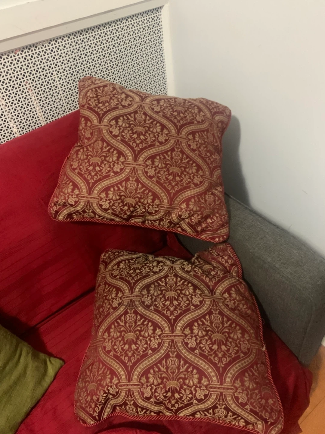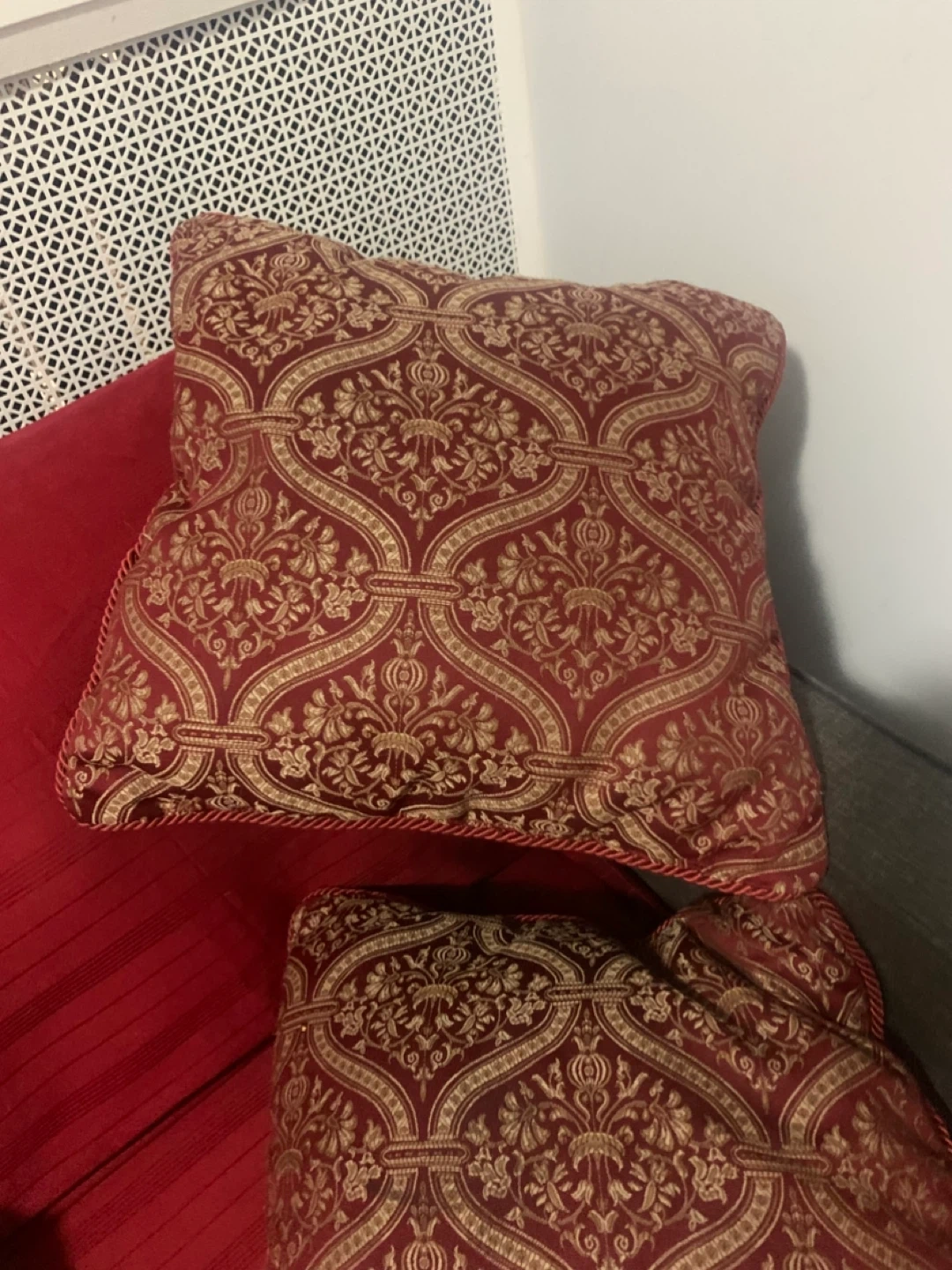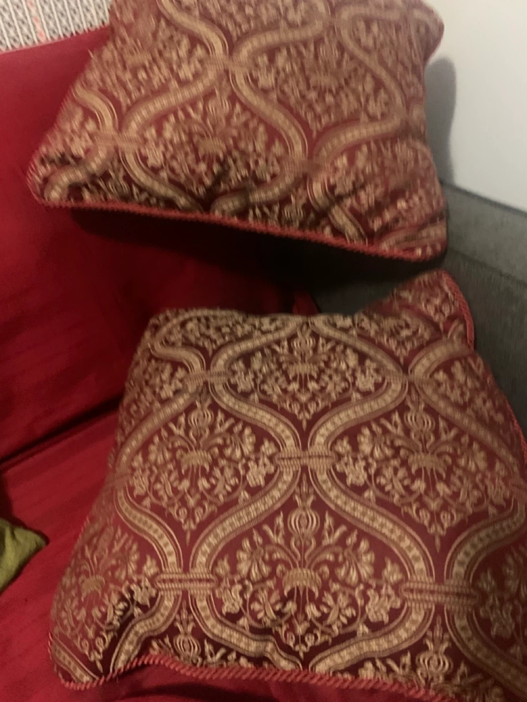 144Selling a set of two decorative throw pillows. They feature a beautiful pattern in shades of red and gold, adding a touch of elegance to any living space. They're in great shape and ready for a new home! $5 each