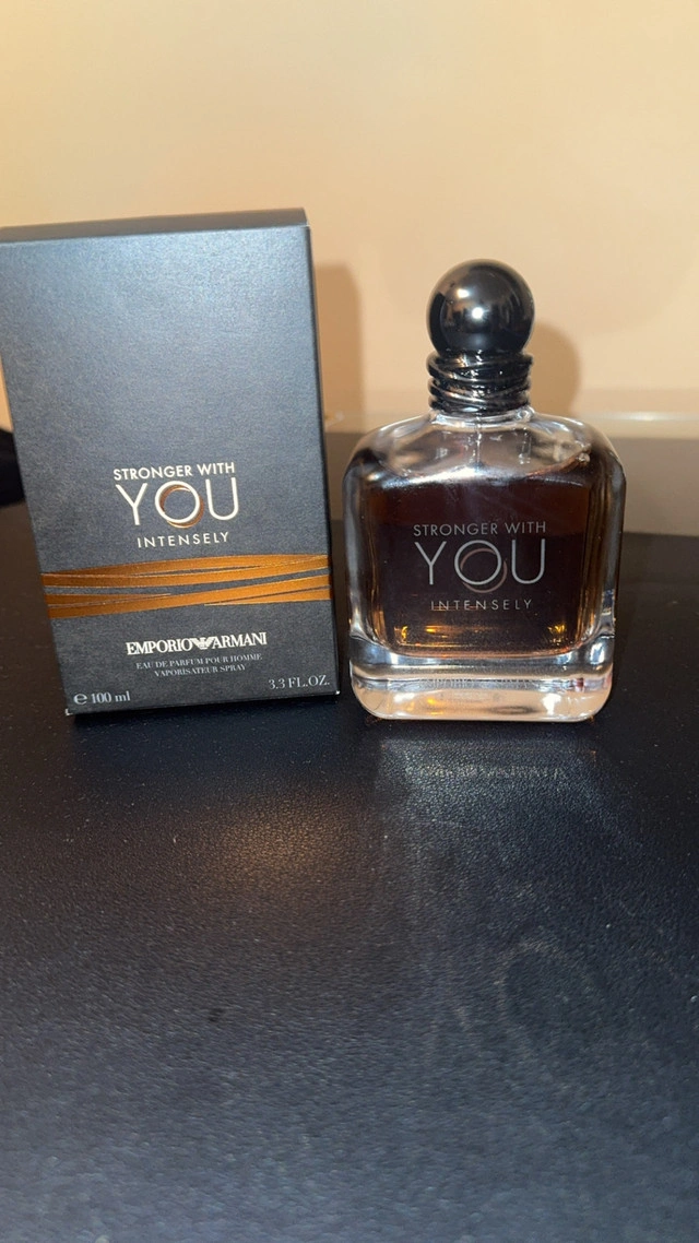 Selling a used bottle of Armani Stronger With You Intensely cologne with 100ml of fragrance. There's plenty of life left in it. This fragrance is known for its warm and spicy notes. Fragrance: Eau de Parfum. Volume: 100ml. Condition: Used, with a good amount remaining.