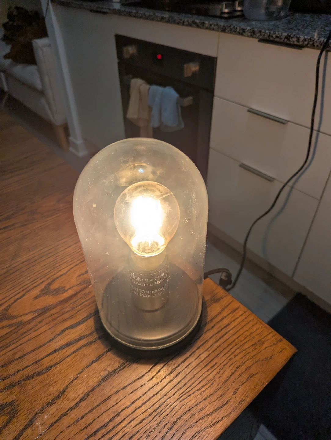 Selling a vintage-style table lamp with a clear glass dome. It's in great condition and adds a unique touch to any room! The lamp has a black base and a standard light bulb socket. Perfect for adding a warm glow to your space