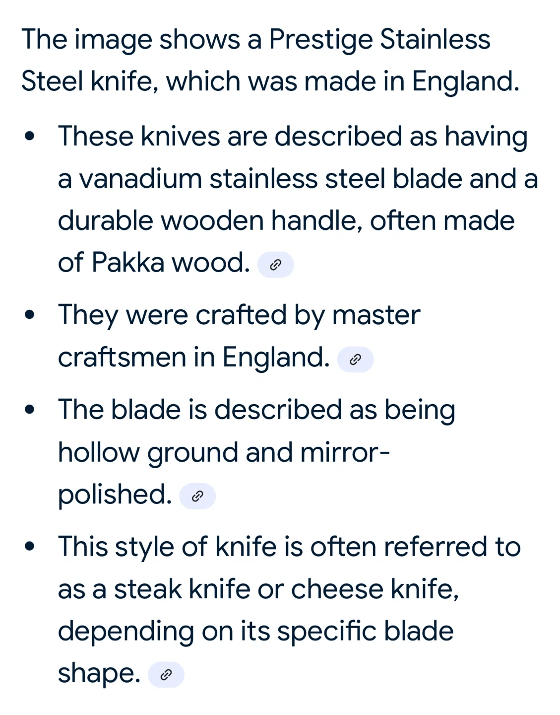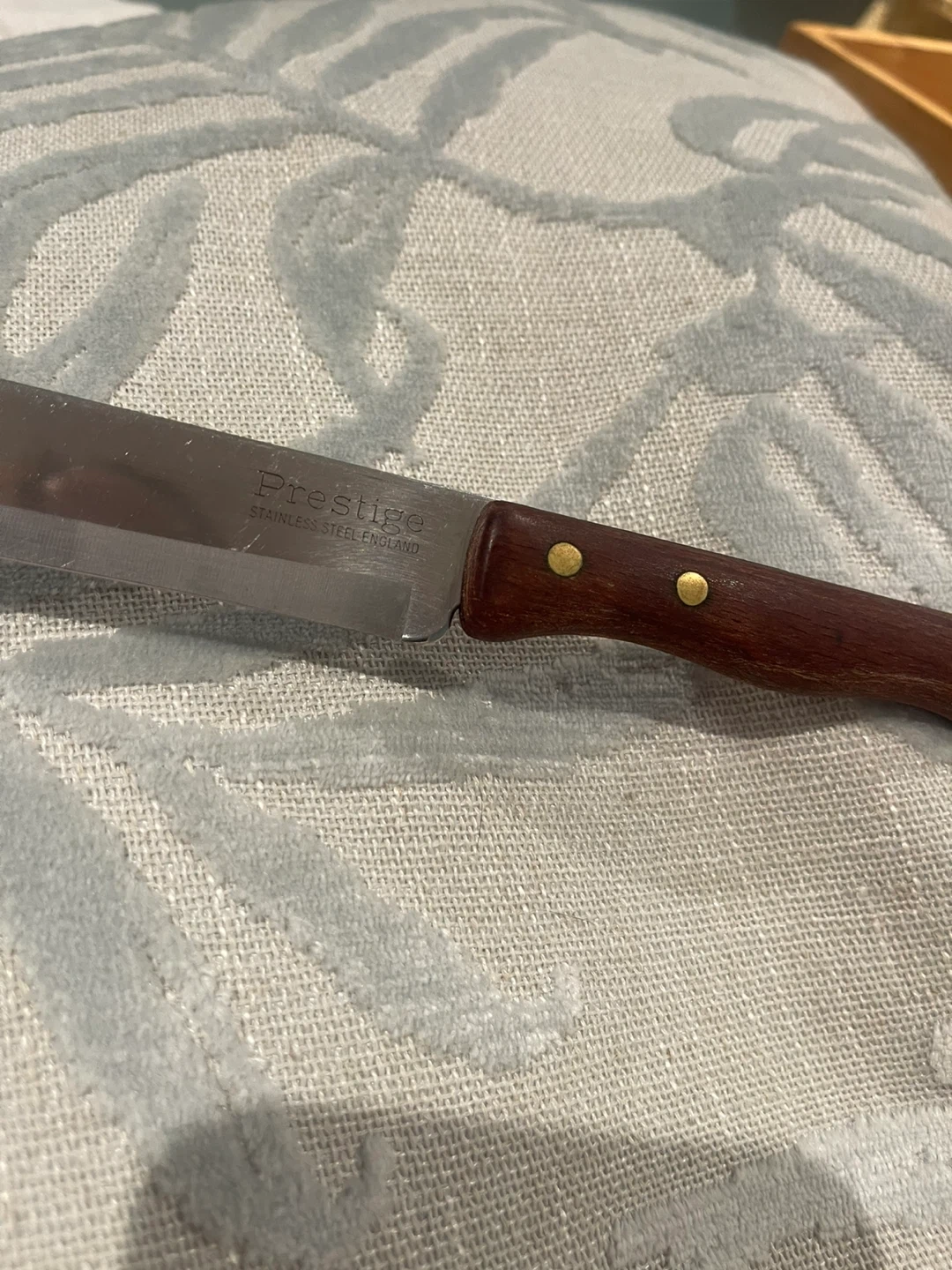 Selling a Prestige Stainless Steel knife made in England! It has a vanadium stainless steel blade and a durable wooden handle. The blade is hollow ground and mirror-polished. This style of knife is often referred to as a steak knife or cheese knife, depending on its specific blade shape