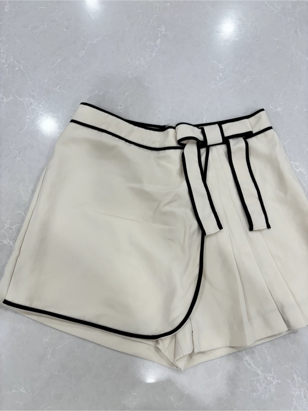 643Selling a pair of skirt shorts. They are a size 4 and have a cute bow detail. The shorts are cream coloured with black trim.