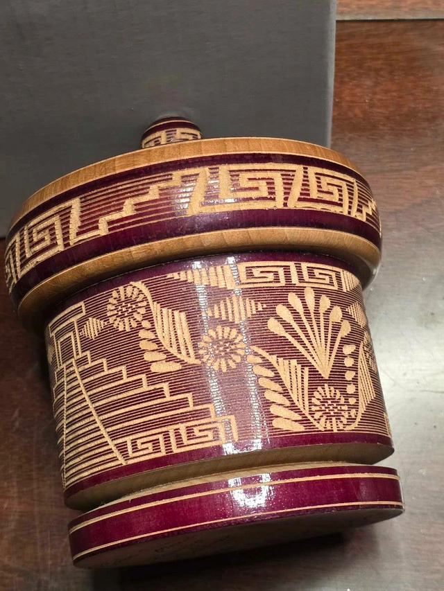 86I'm offering a unique, hand-carved trinket box from Ignacio Saldivar, Cabo San Lucas, Mexico. This charming piece features intricate designs and craftsmanship. It is in used condition, showing some signs of wear, which adds to its character. A lovely addition to any collection!