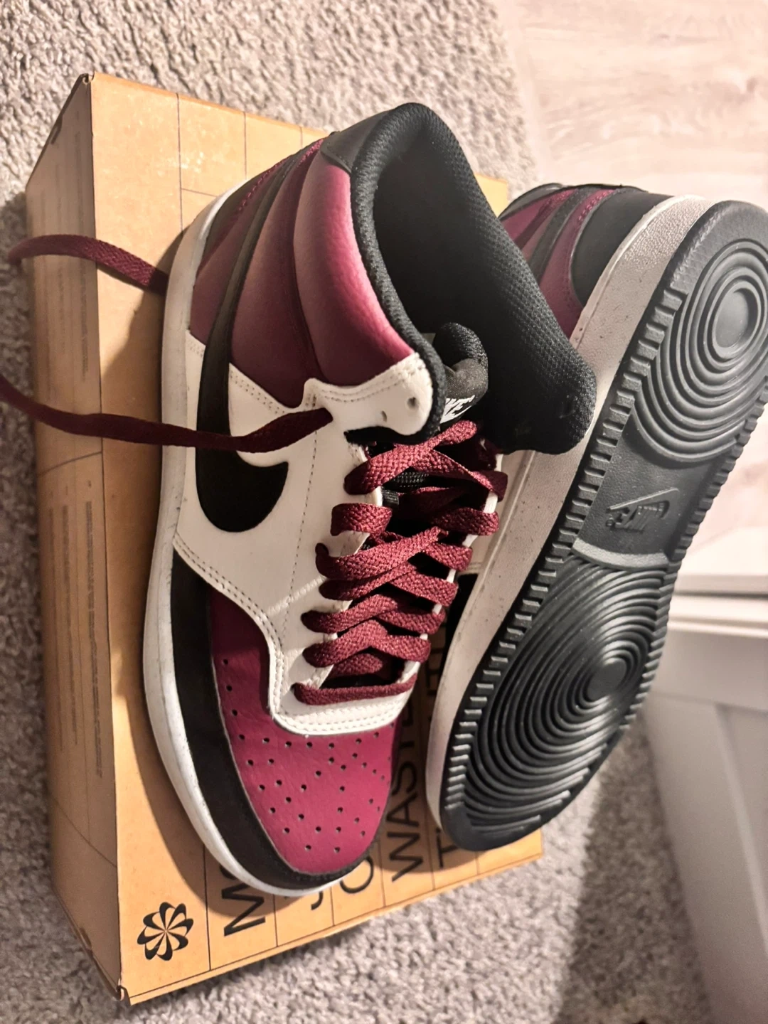 Selling a pair of Nike Court Vision Mid NN sneakers in a dark beetroot/black-sail colourway. The size is US 9. Comes with the original box!