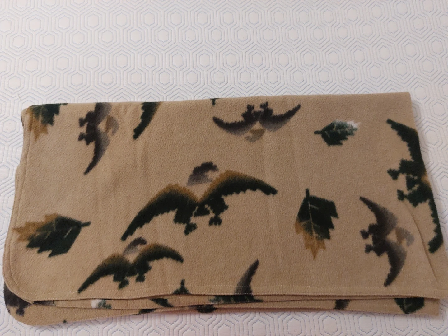 Selling a cozy fleece blanket featuring a unique bird and leaf design. It's in great condition and perfect for keeping warm on chilly evenings. Light brown colour.