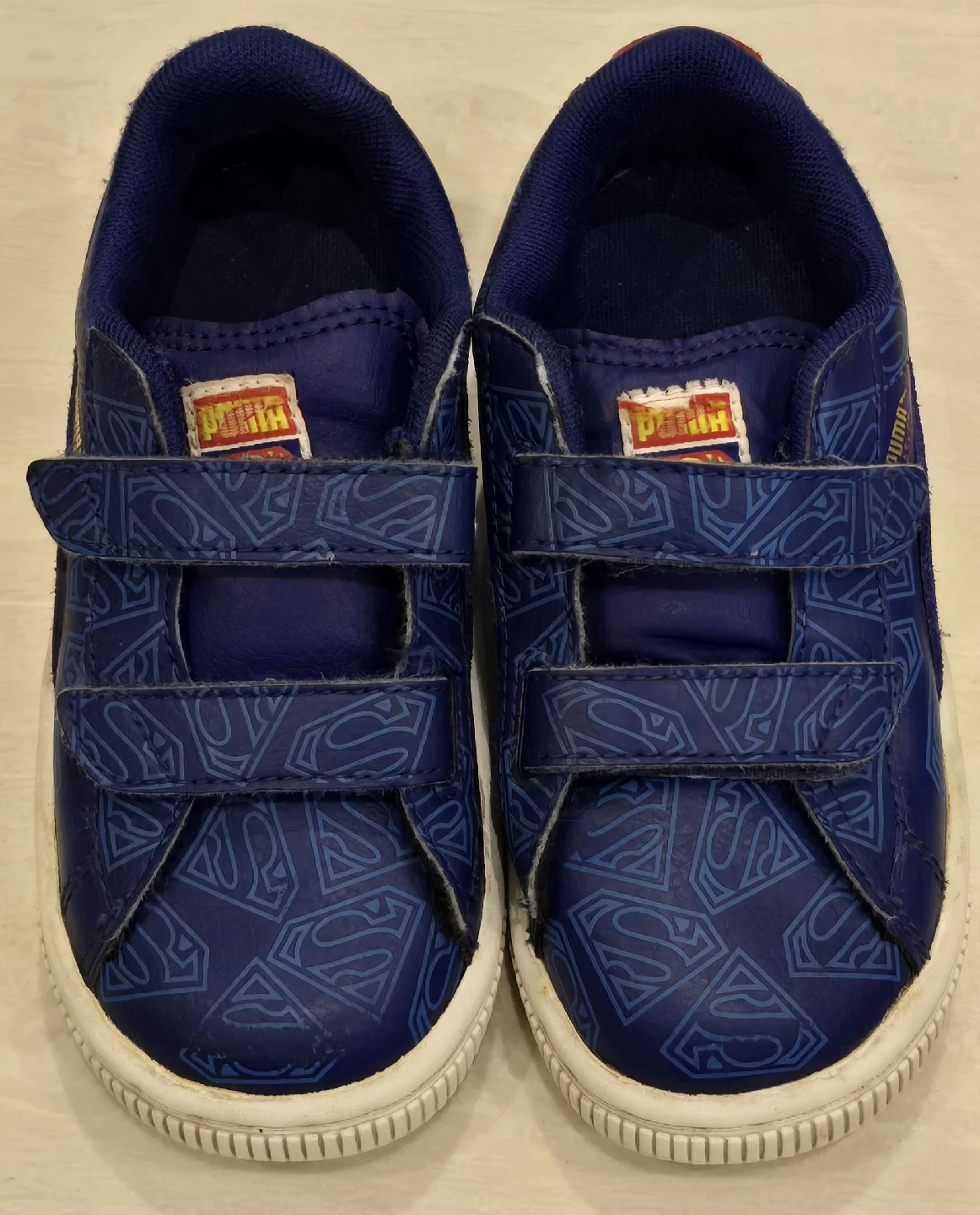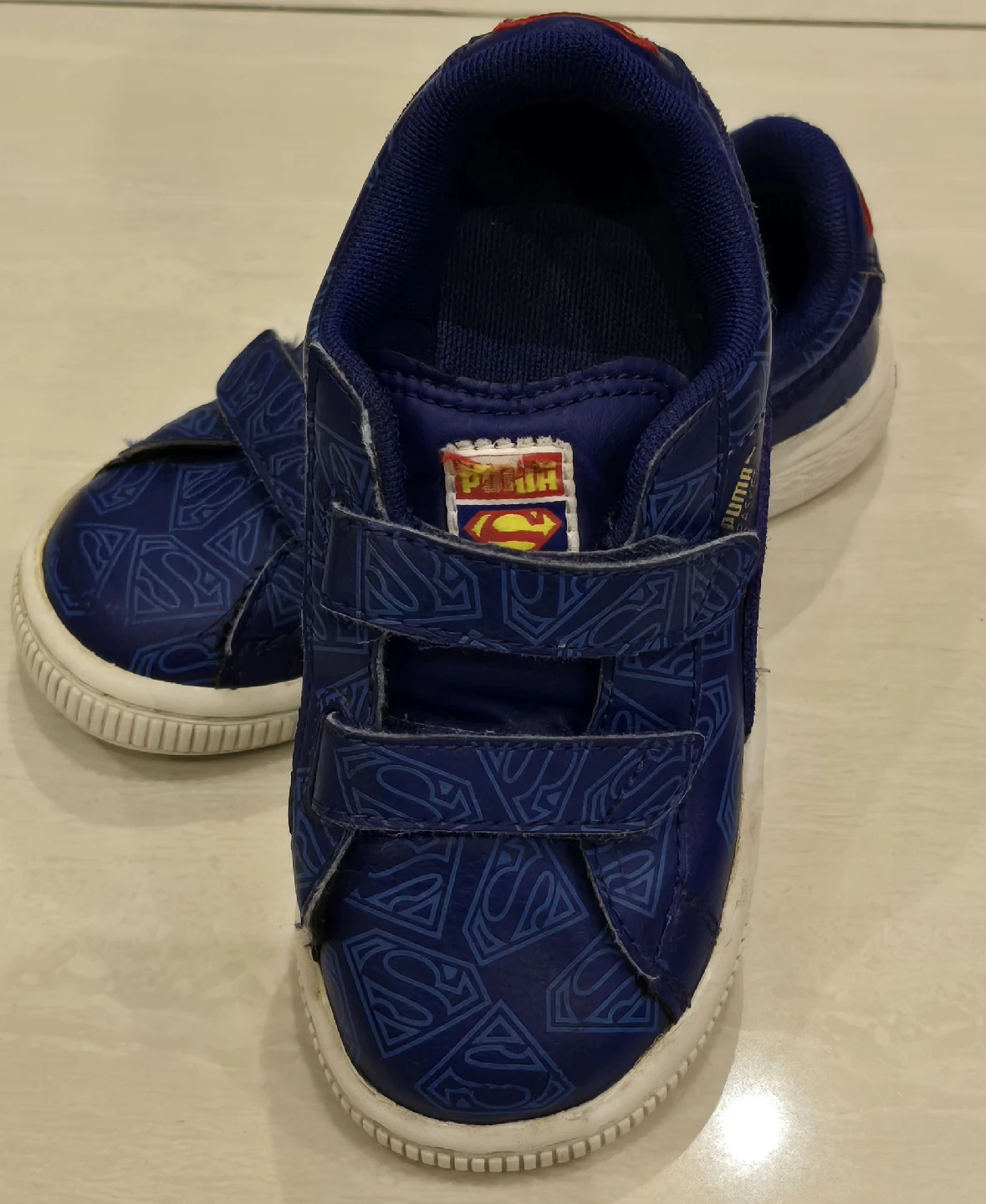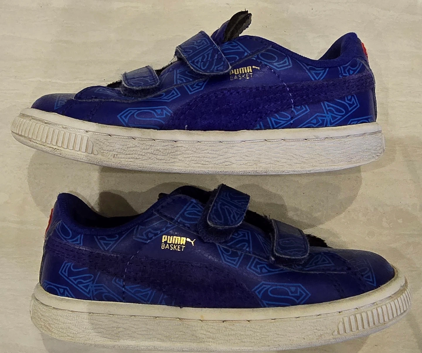 These adorable blue Puma shoes feature a fun Superman design! They're still in great condition with velcro for easy on and off. Perfect for your little superhero! Size 10 kids.