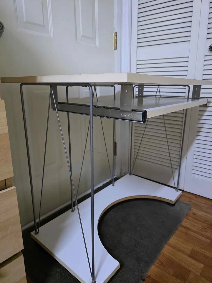Used but in good condition. This desk has a smooth white surface and a pull-out keyboard tray that slides easily. It’s perfect for a small workspace, home office, or study area. The metal frame is solid and stable, though the side rods show a bit of rust from age (doesn’t affect function or stability). There are four wheels attached on the bottom of the table. Dimensions: L (32") x W (23.5")x H (30") Price is firm. Pick up near Holdom Skytrain Station