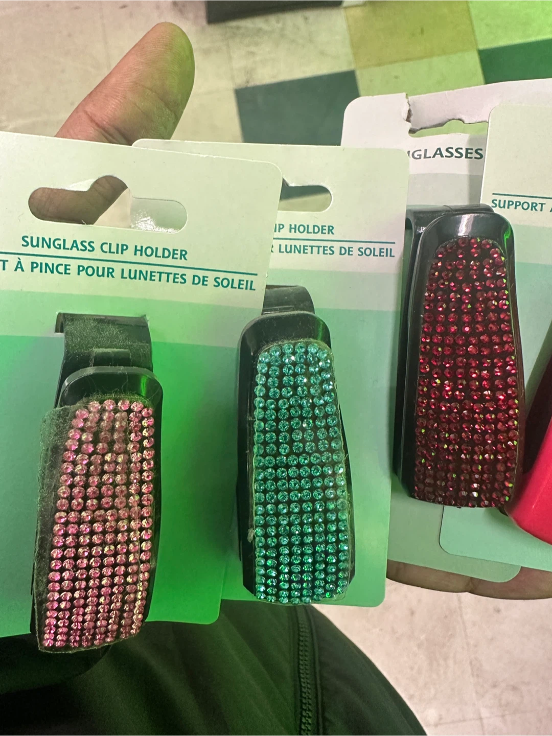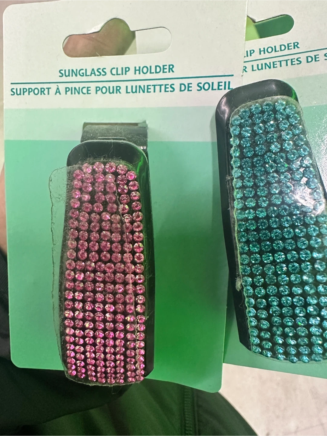 Add a touch of sparkle to your car with these blinged-out sunglasses clip holders! They easily attach to your visor to keep your sunglasses safe and within reach. Available in pink, teal, and red.
