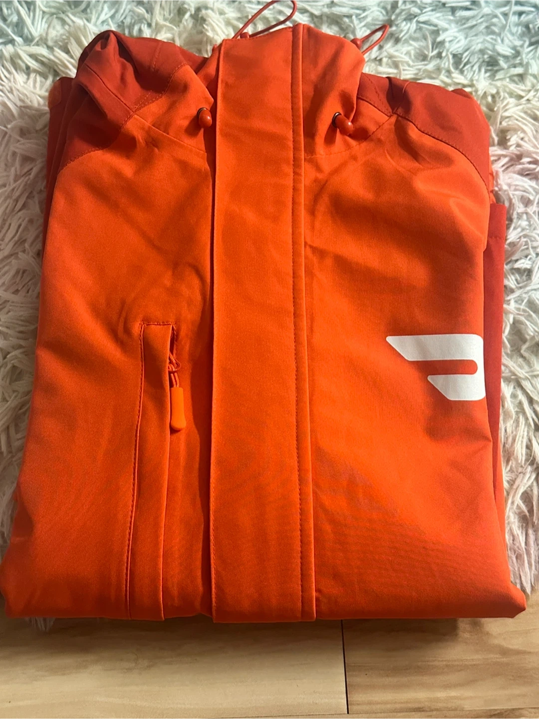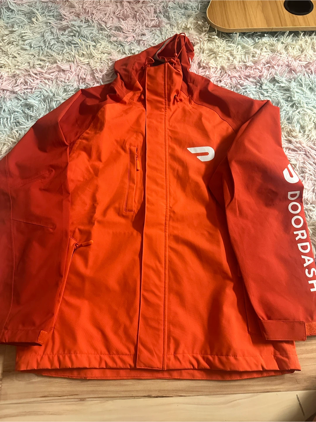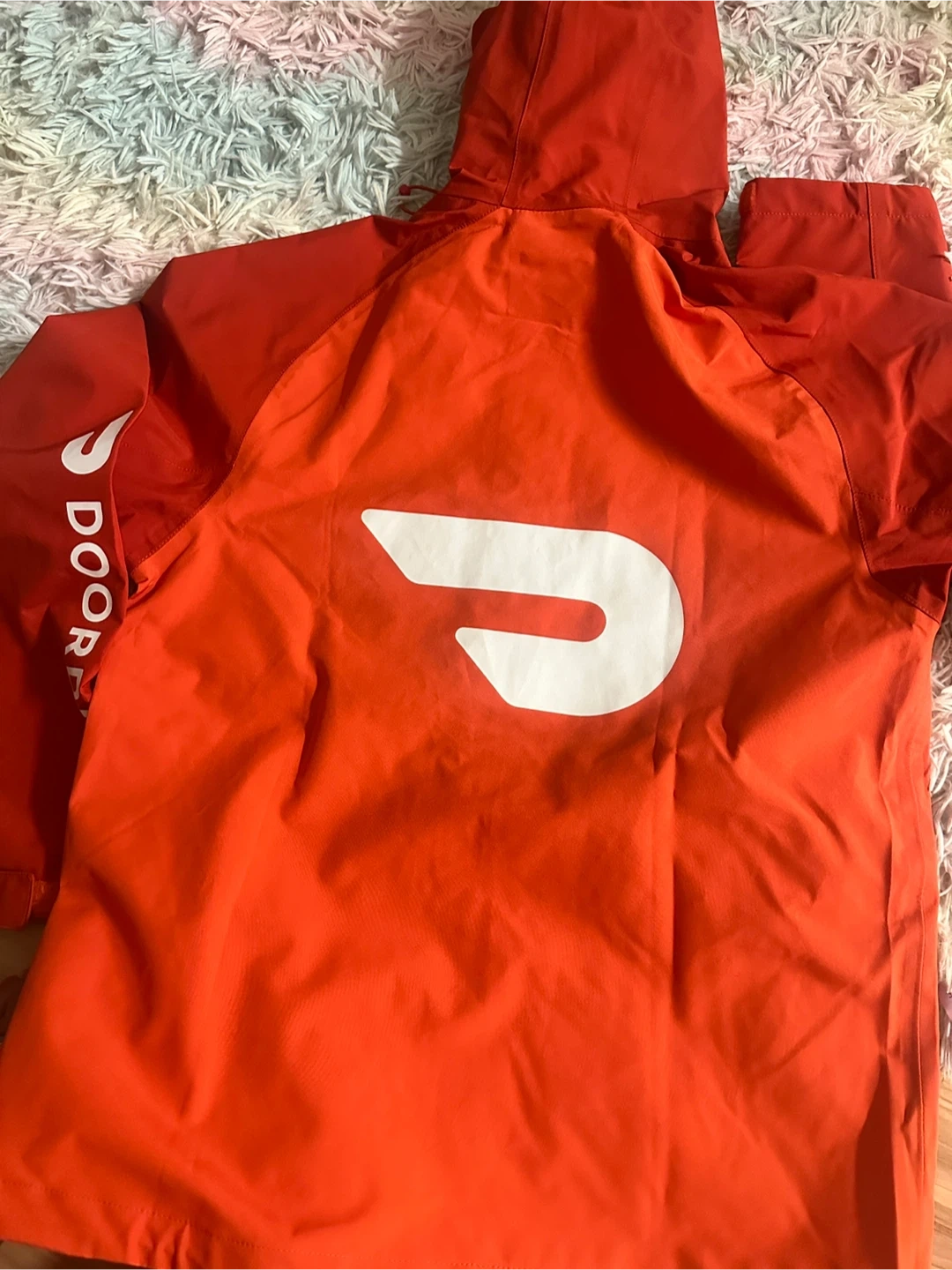Selling a DoorDash jacket in size M/M. It's a bright orange colour with the DoorDash logo on the front, back, and sleeve. Perfect for staying warm while dashing!