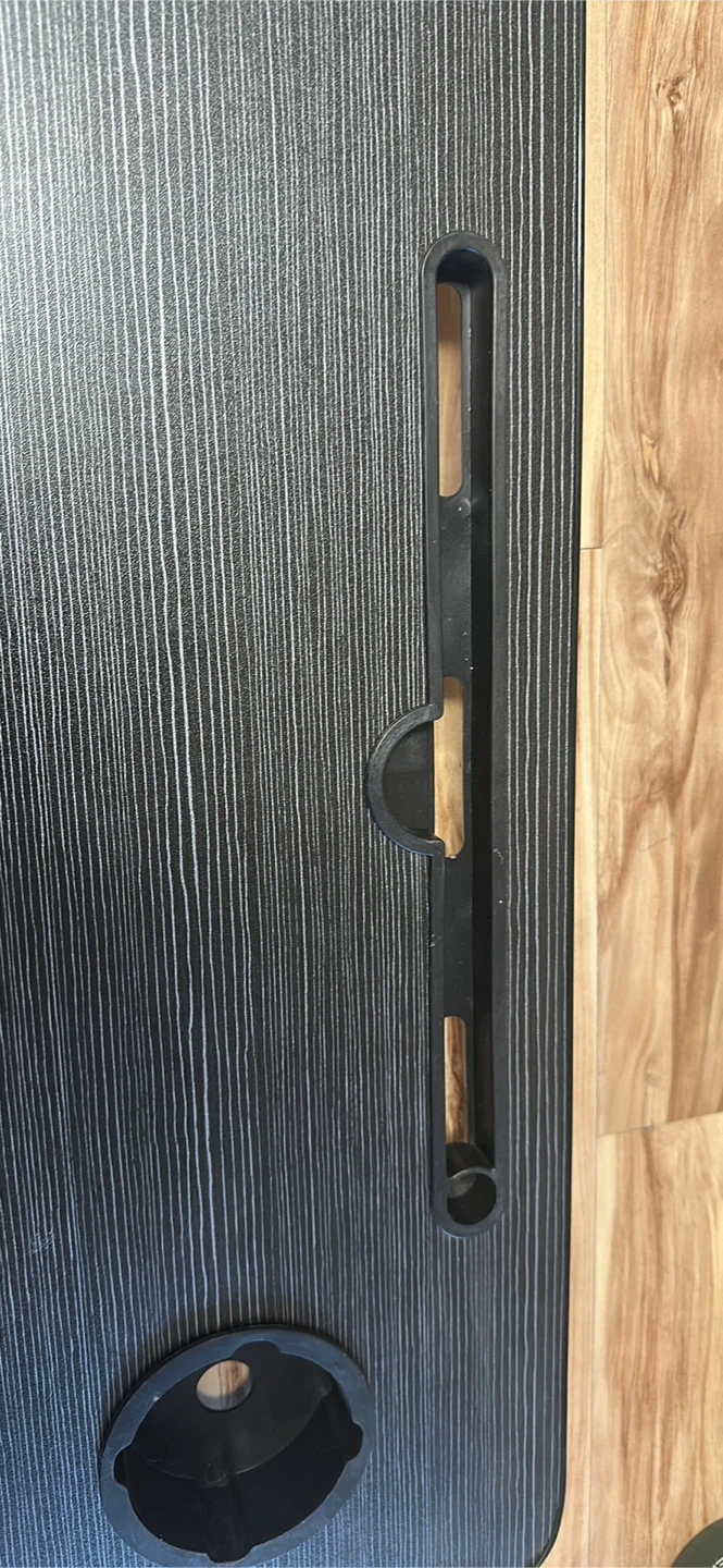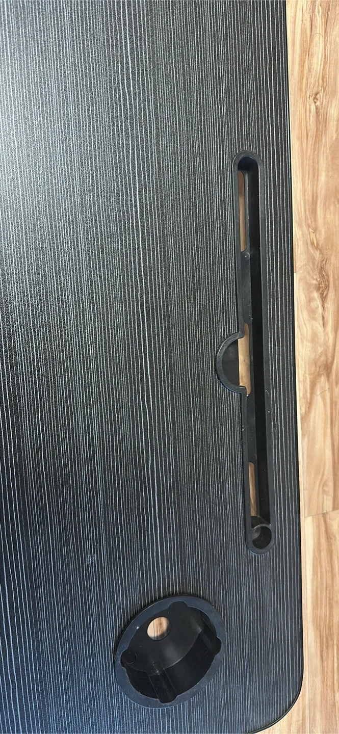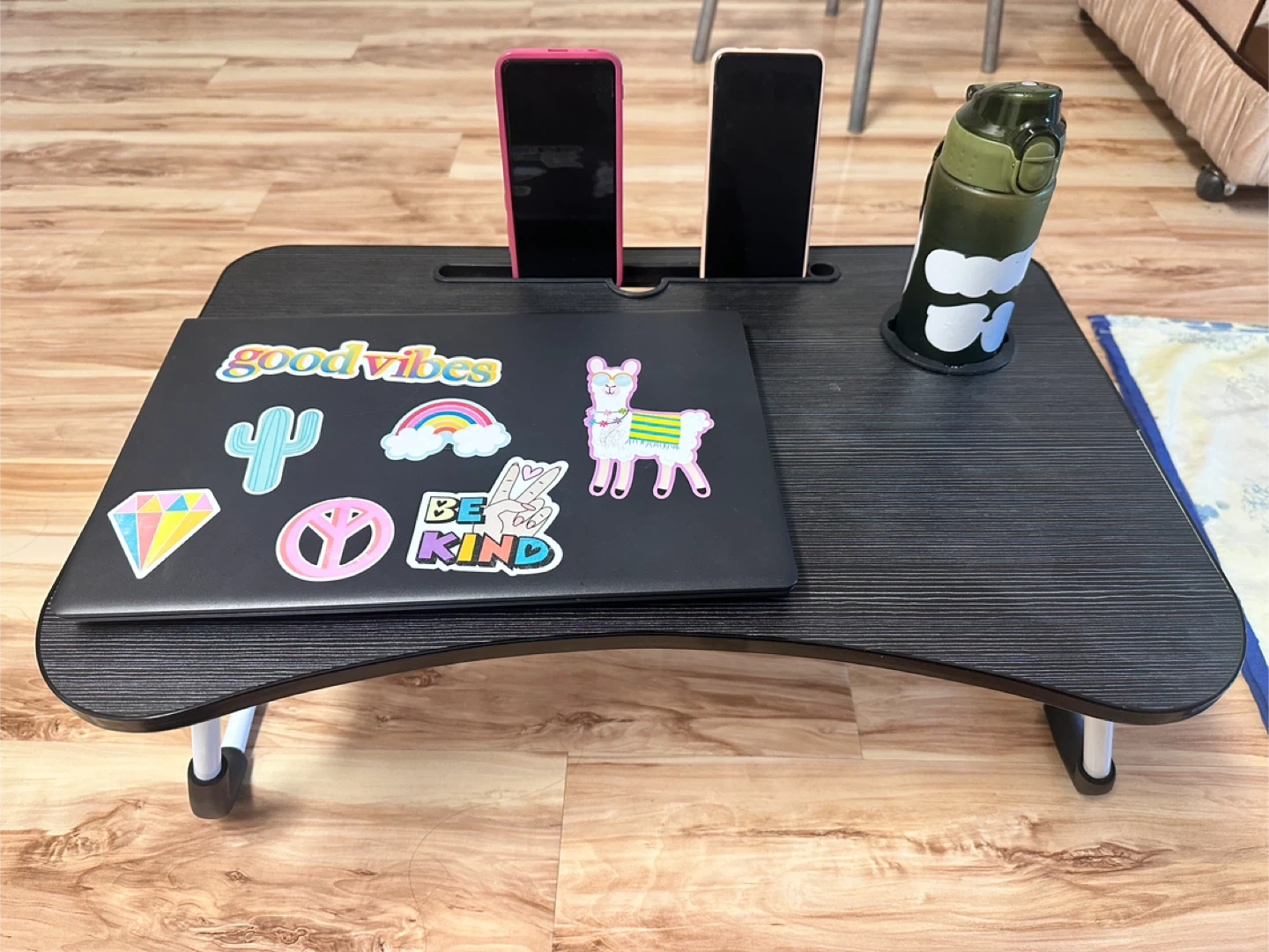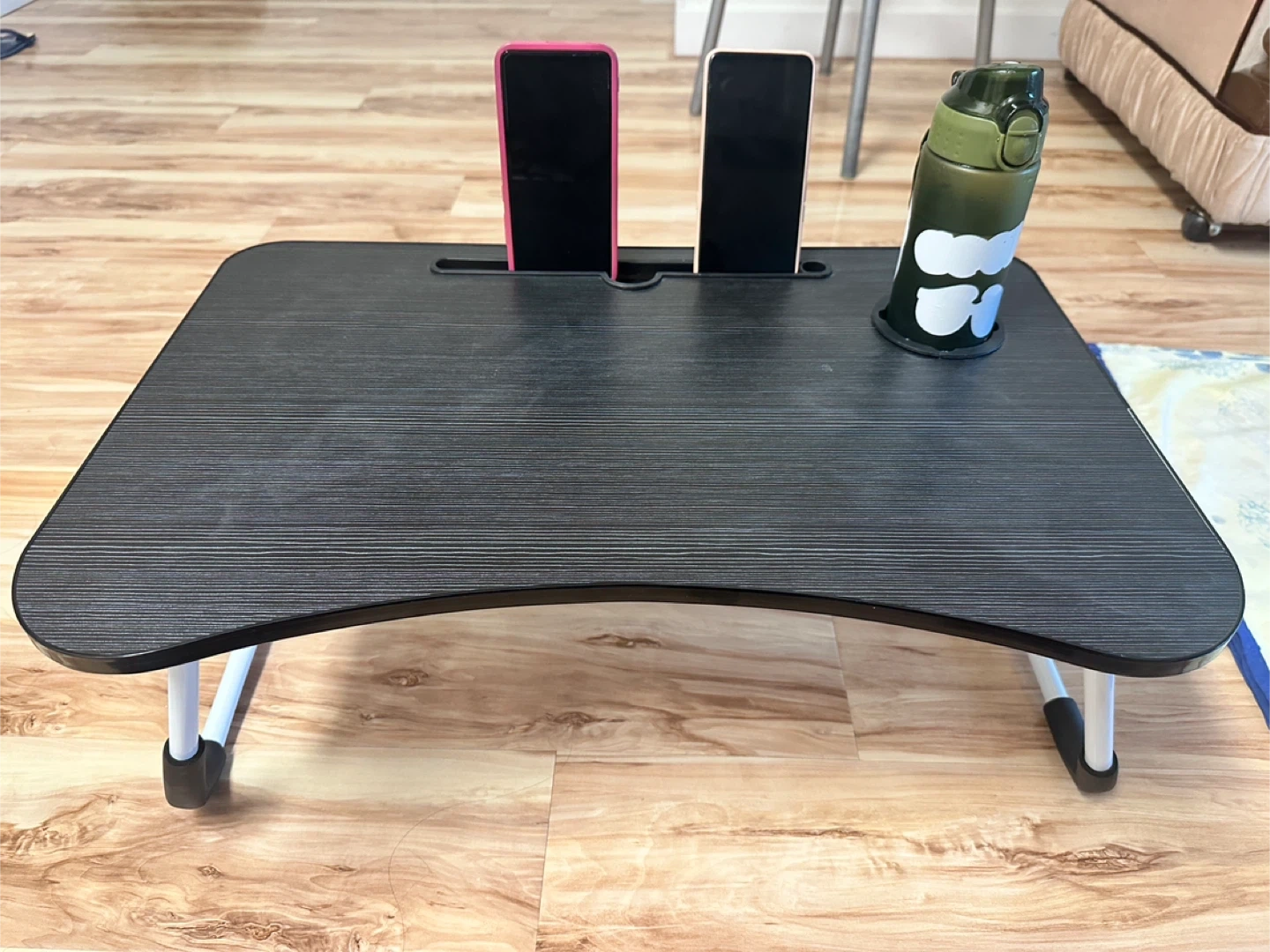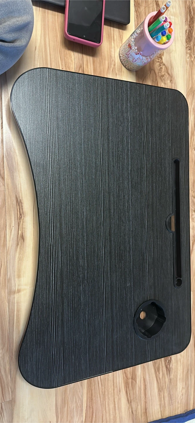 Selling a foldable laptop desk in black. It has a slot for holding your phone or tablet and a cup holder. Perfect for working from home or studying in bed!
