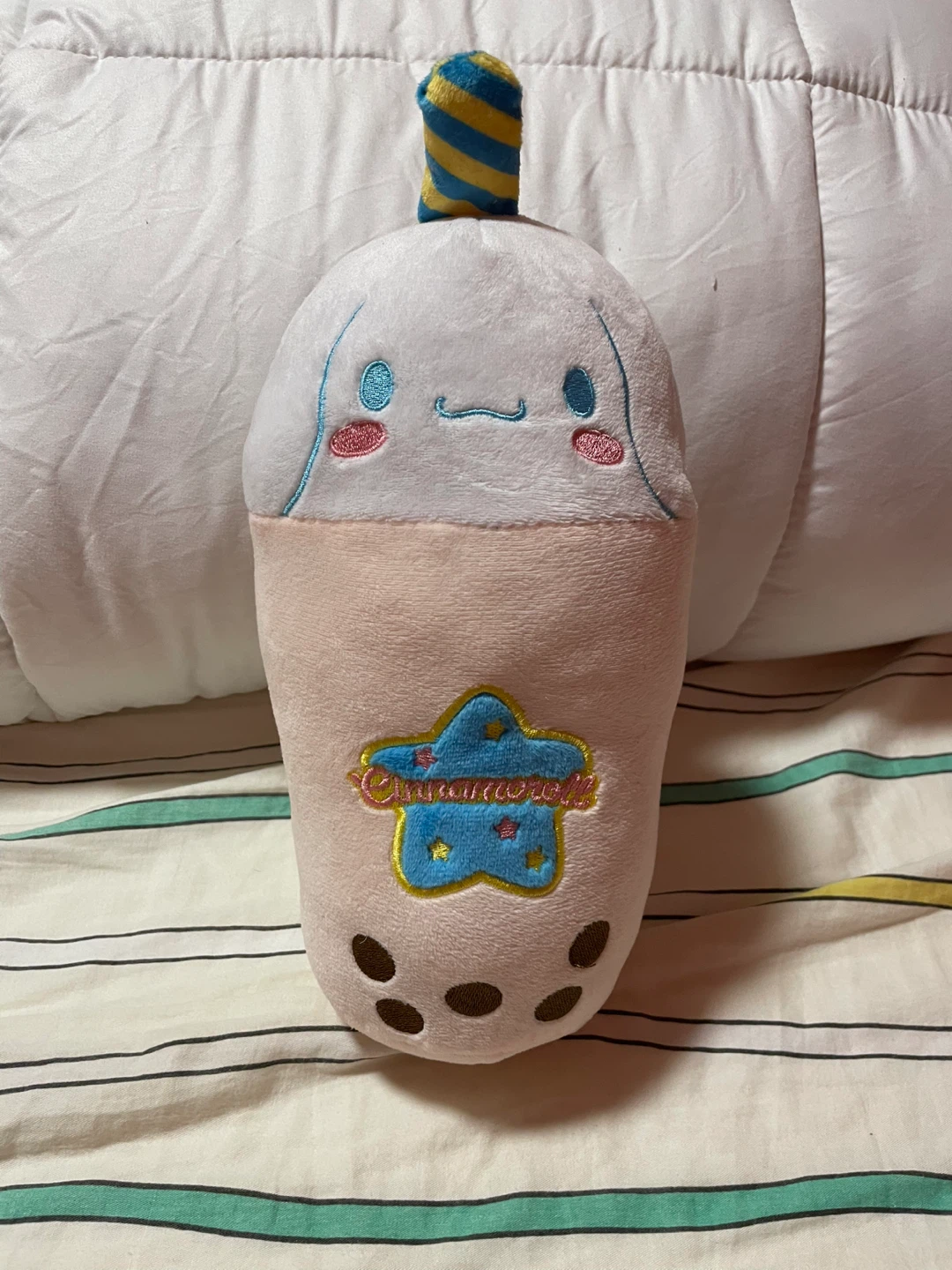 This adorable Cinnamoroll plushie is shaped like a boba drink! It's in great condition and ready for a new home. The tag indicates it's suitable for ages 3+