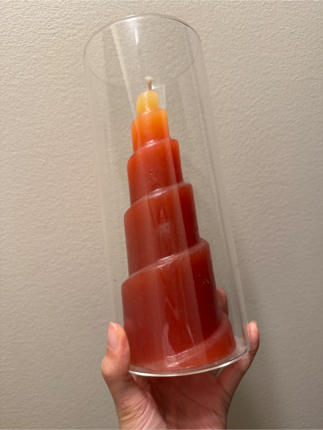 65Selling a unique candle with a layered design, housed in a clear glass holder. The candle features a gradient of colours, from yellow to orange to red, creating a warm and inviting glow when lit. It's perfect for adding a touch of style and ambiance to any room!