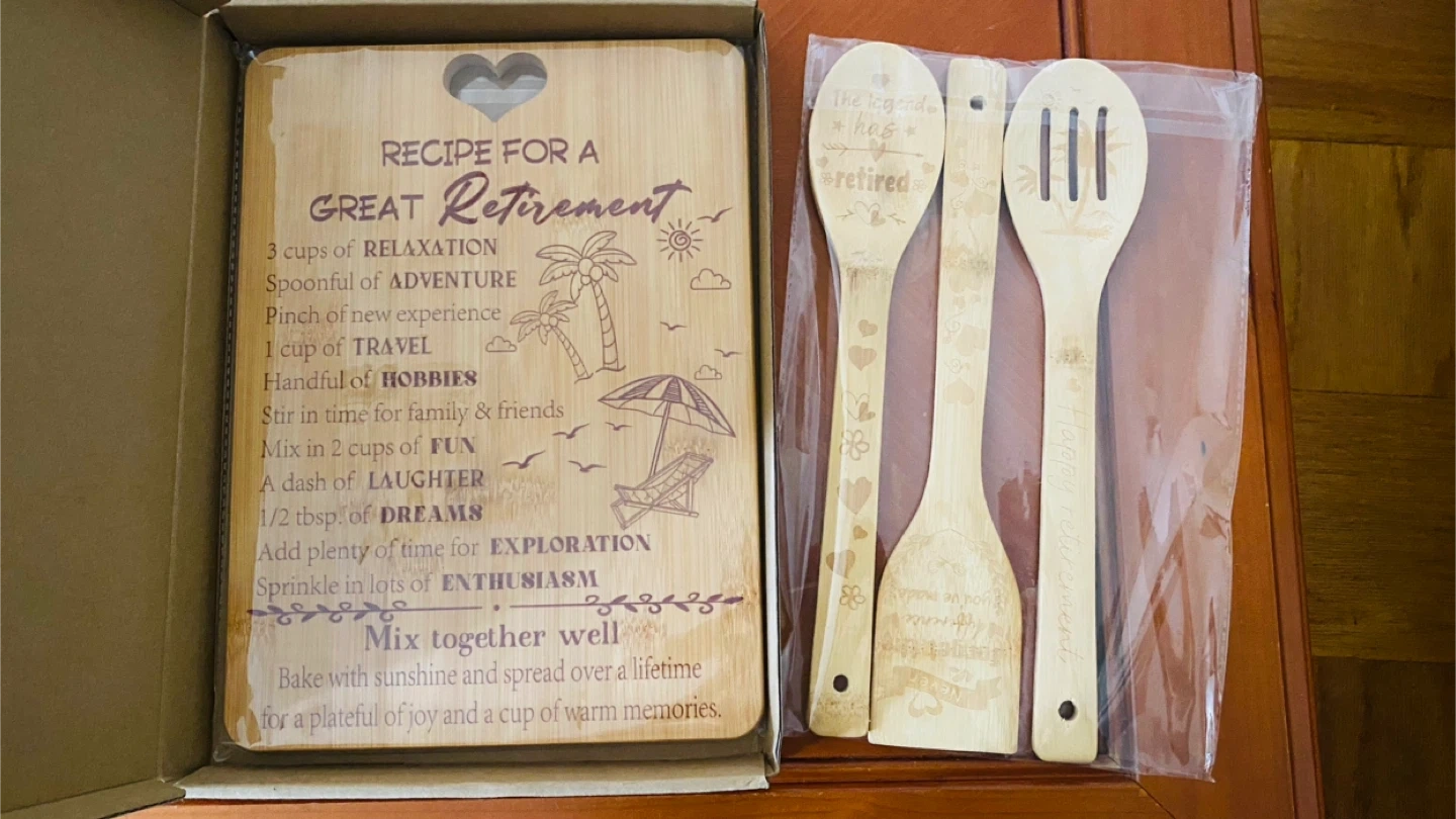 This is a cute retirement gift set that includes a bamboo cutting board with a heart cutout and a recipe for a great retirement! It also comes with three bamboo spoons, perfect for adding a touch of joy to any kitchen. The spoons have fun retirement-themed engravings, making this a thoughtful and unique present for someone starting their next chapter