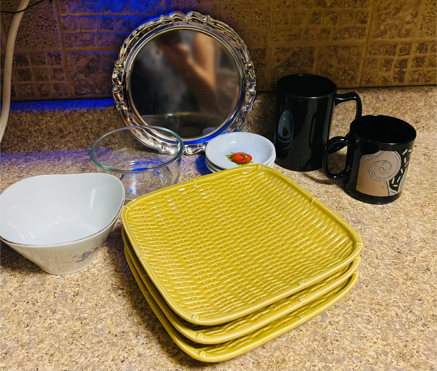 I have a variety of dishes and mugs available. There's a mix of styles and materials, perfect for adding some variety to your kitchen collection. They are in great condition and ready for a new home!