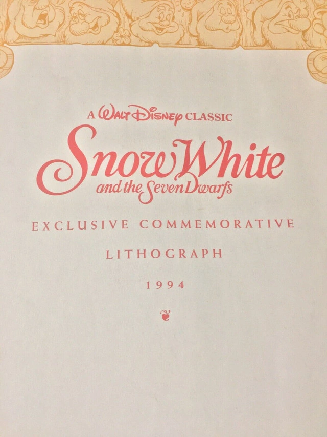 Lithograph is New in envelope from 1994. Disney Store exclusive. “Snow White and the Seven Dwarfs” (1937) Measures appx. 12 x 16 inches
