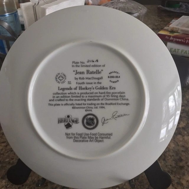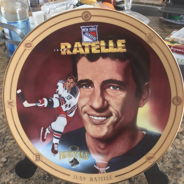 184Legends Of Hockey’s Golden Era Plate Series #4 BRADFORD EXCHANGE LEGENDS OF HOCKEYS GOLDEN ERA PLATE JEAN RATELLE, NEW YORK RANGERS. Actual size of each plate is 8 1/4" in diameter. 22-KARAT GOLD RIM FINE PORCELAIN PLATE. Plate number 216A. Plate in excellent condition with no chips, markings or scratches. Graphics are vibrant. Please see pictures for further details. These plates are not for food use. Niagara Falls pick-up.