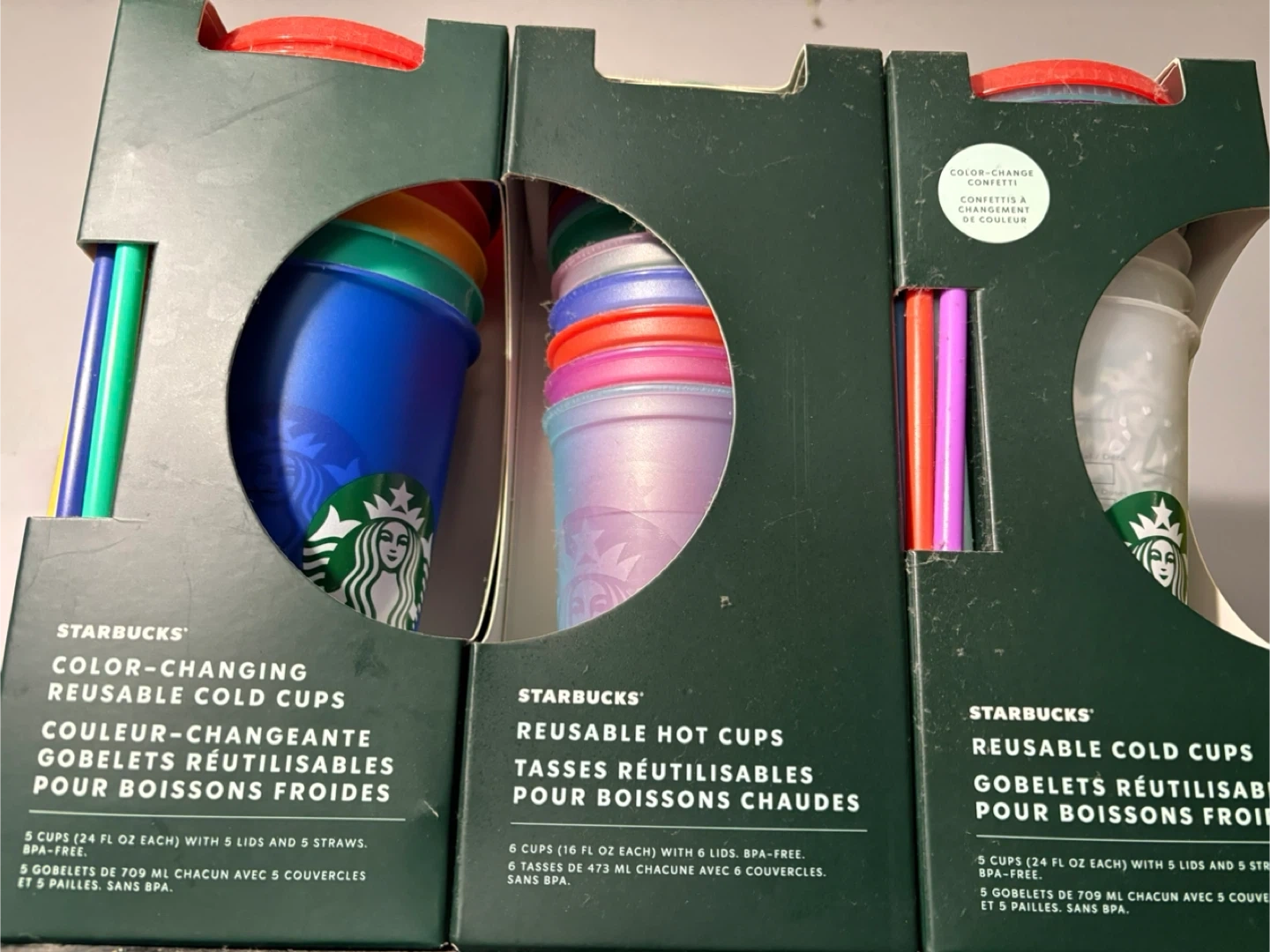 I have a set of Starbucks reusable cups available! These are colour-changing cups, perfect for both hot and cold drinks.