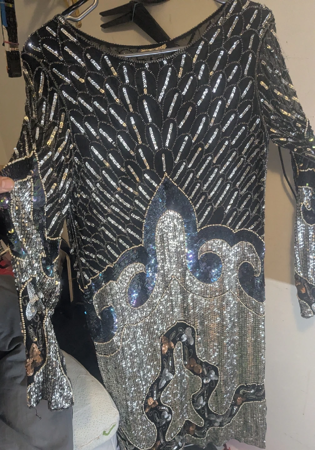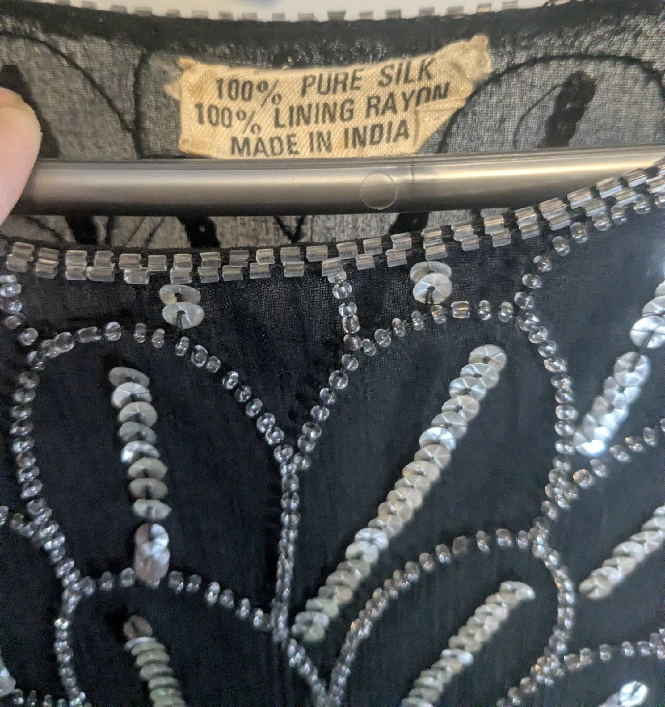 Gorgeous vintage beaded dress with intricate detailing! It's made of 100% pure silk with a 100% rayon lining. The dress was made in India and has a stunning design with silver and black beads.