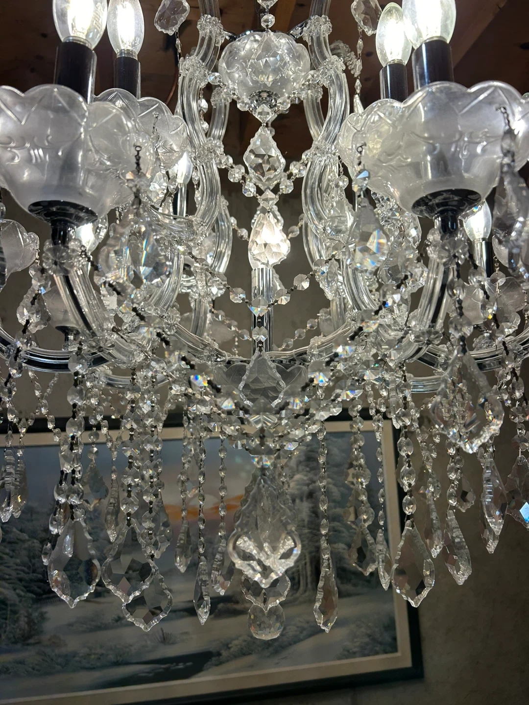 Selling a beautiful crystal chandelier that adds a touch of elegance to any room. It features multiple tiers of shimmering crystals and creates a stunning visual effect when lit. Perfect for dining rooms, living rooms, or entryways!