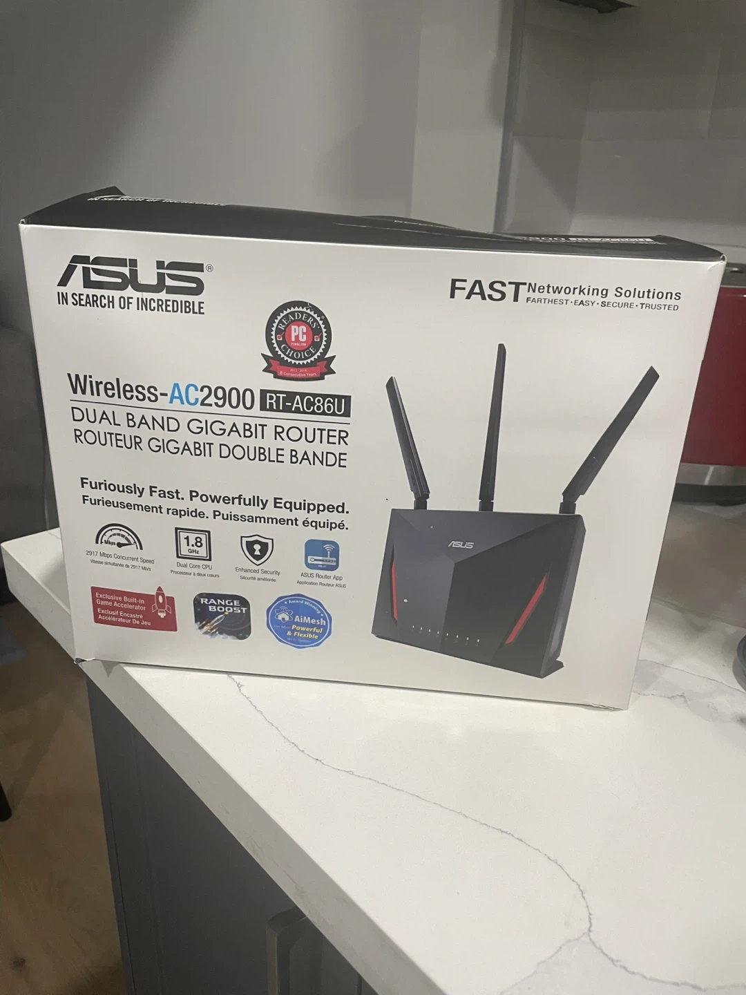 65Selling an ASUS RT-AC86U Dual Band Gigabit Router. It comes with the box and all the included components, including the power adapter and VIP Member Warranty Notice. It's in great condition and ready to boost your home network!