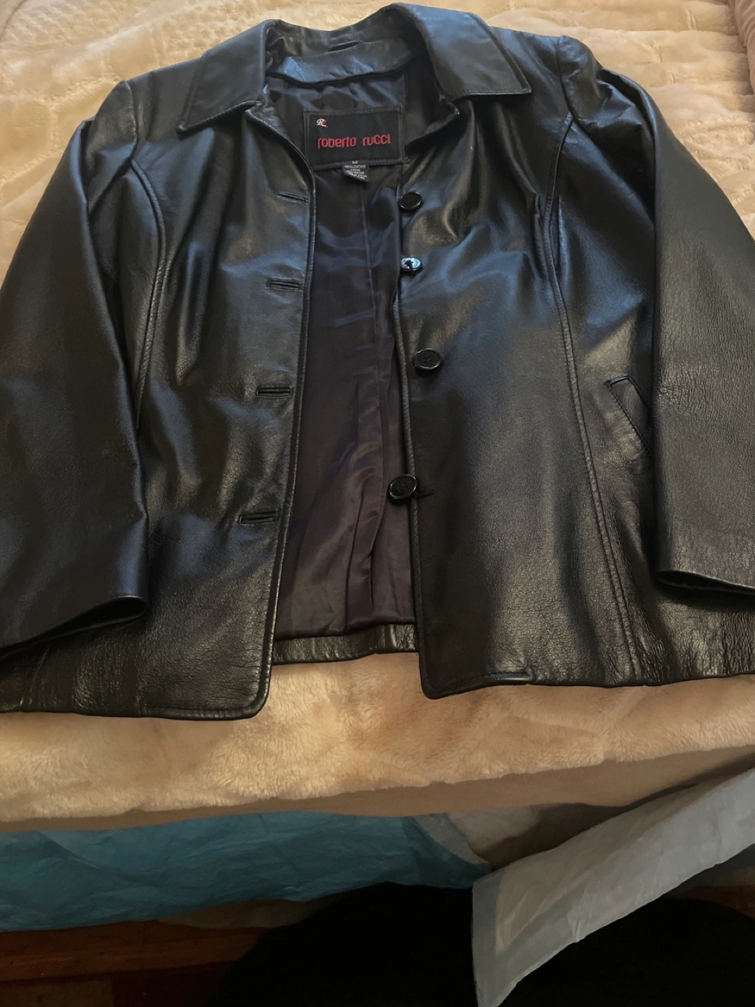 Selling a Roberto Ricci black leather jacket in size medium. It's a classic piece that would look great in any wardrobe! The jacket features a button-down front and a sleek design.