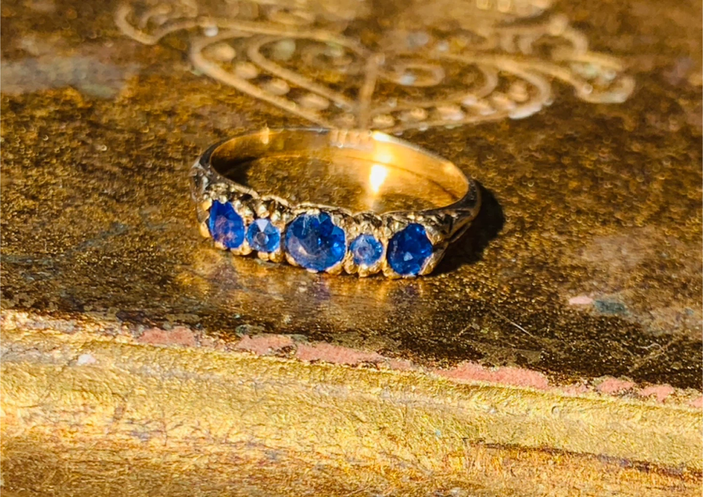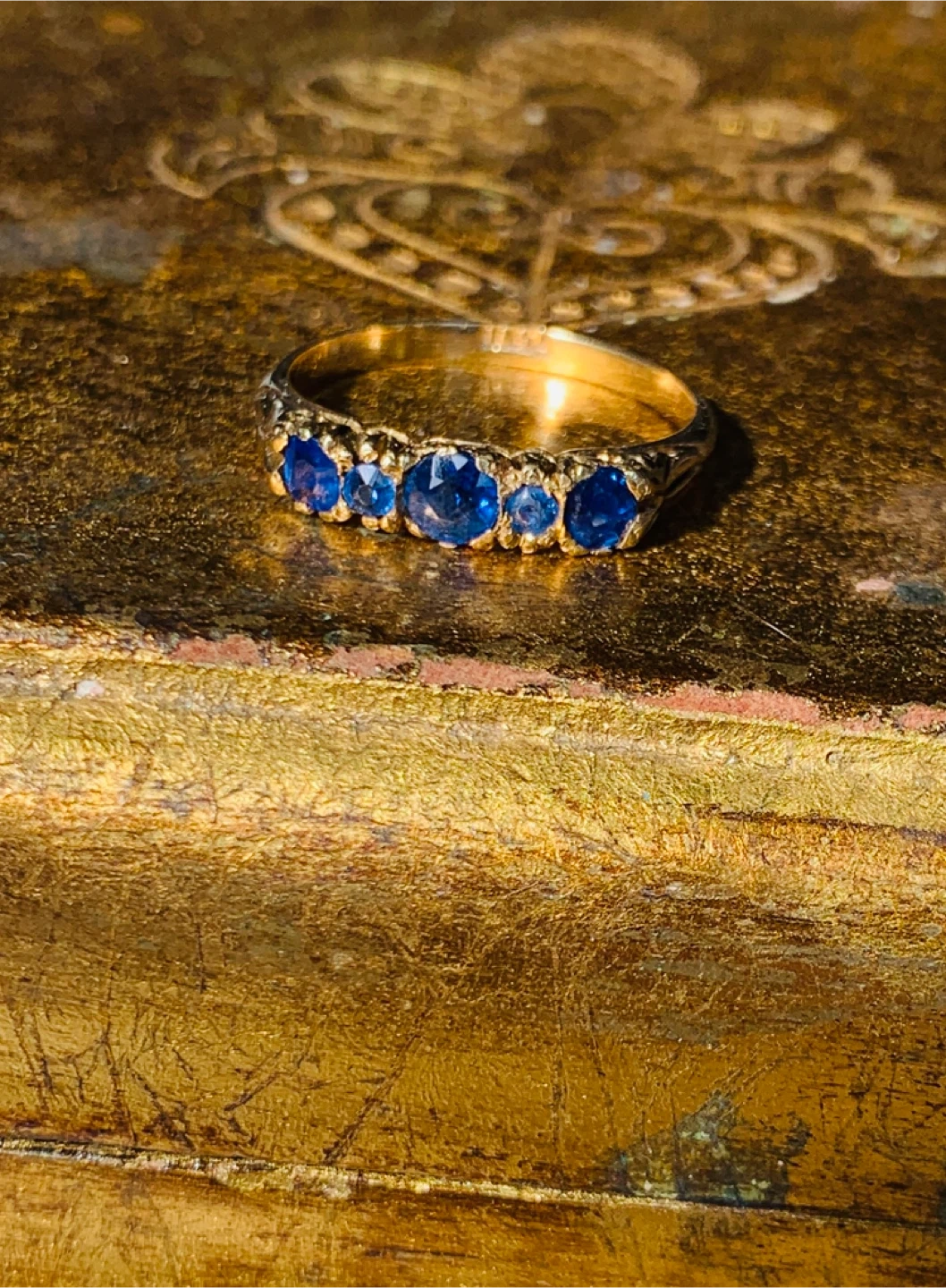 Antique pure 18k Gold, 5 Genuine Sapphire Ring