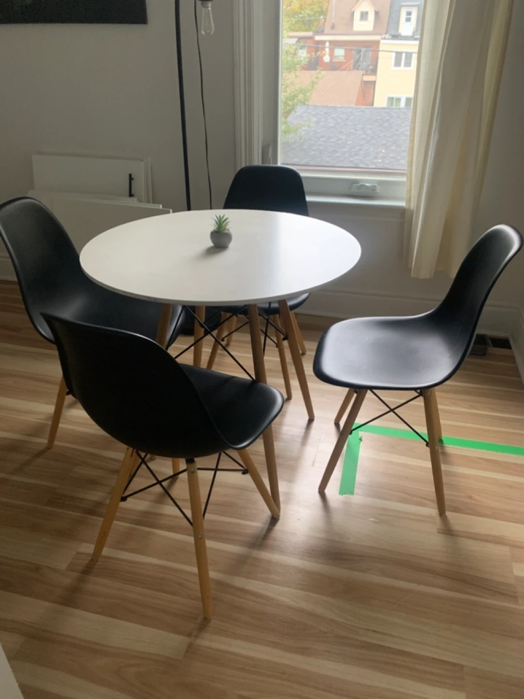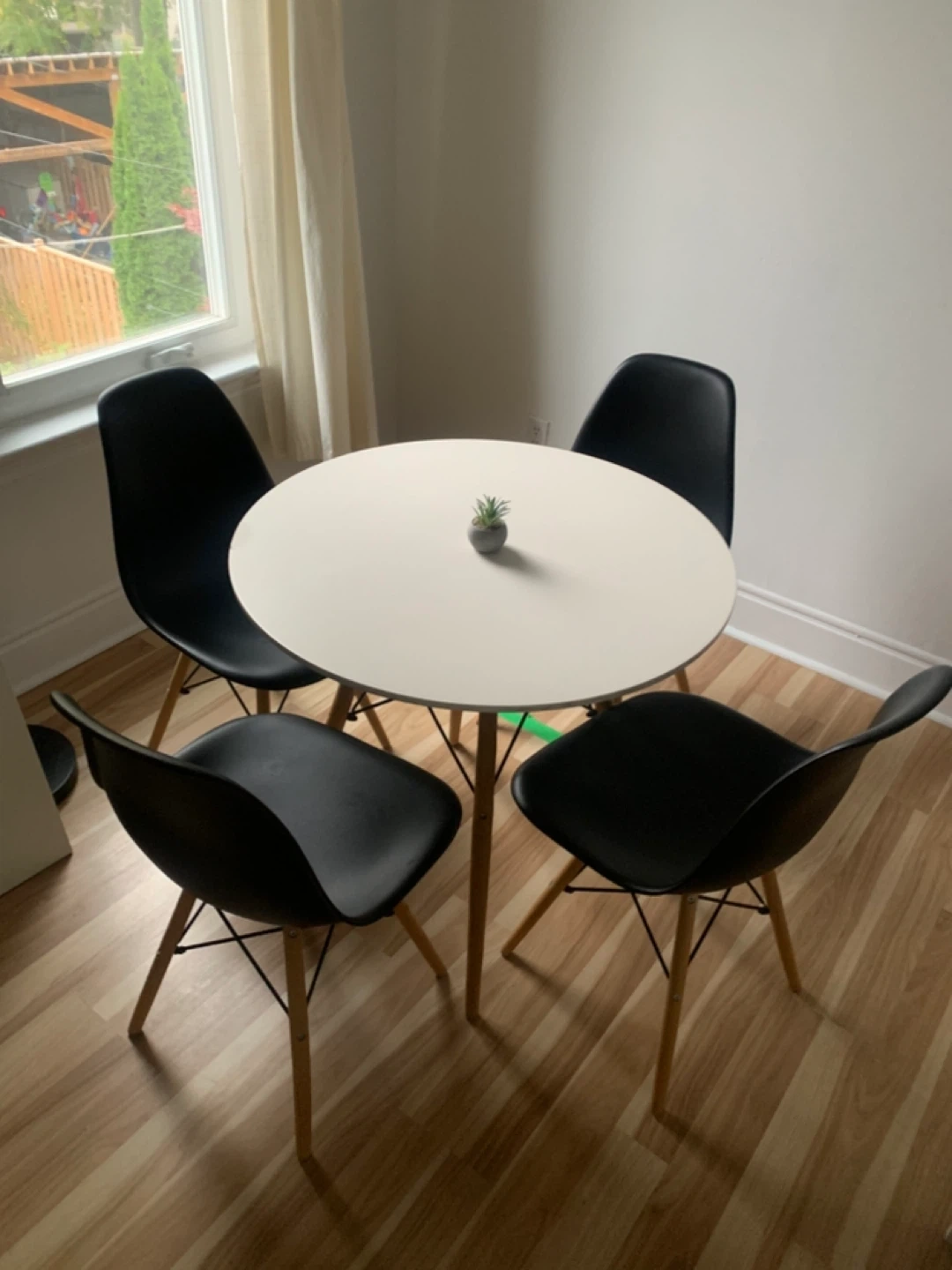 Selling a round dining table with four chairs. The table is white and the chairs are black. There is some wear and tear on the edge of the table, as shown in the photos. Otherwise, the set is in good condition and ready for a new home!