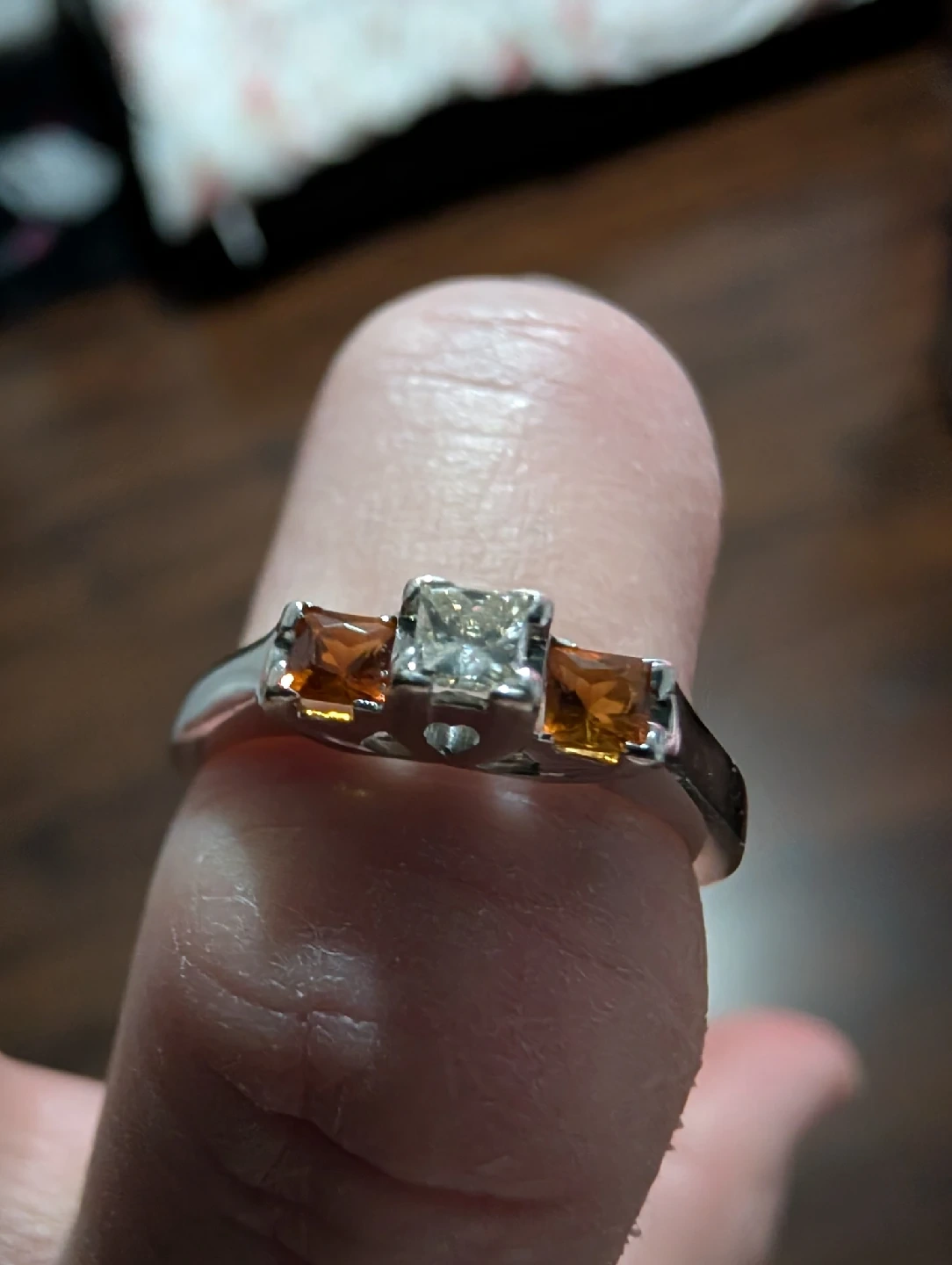 Selling a ring made of 14K gold. It features a centre gemstone and two smaller gemstones on either side. It's a beautiful piece! Size 6.5. November birthstone.